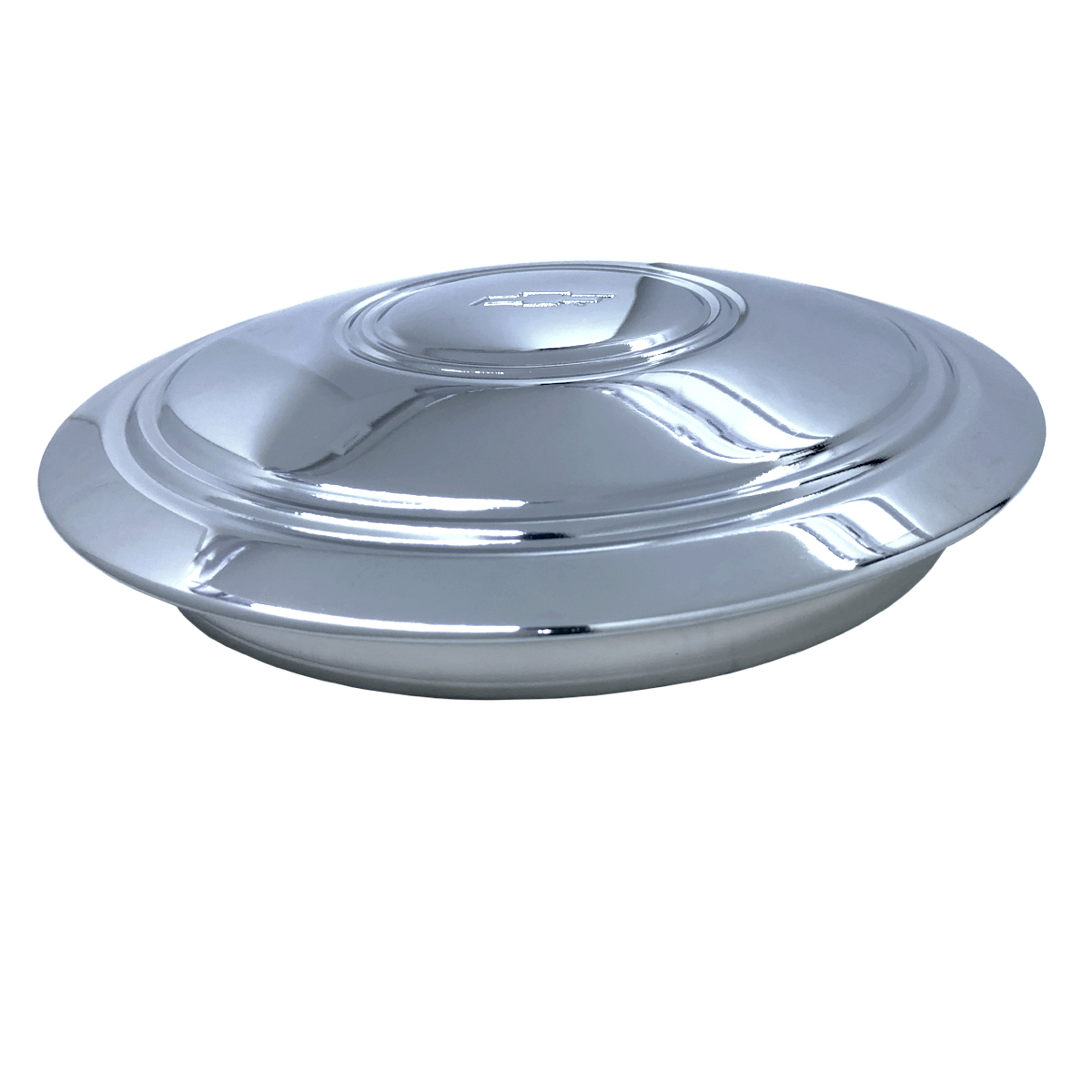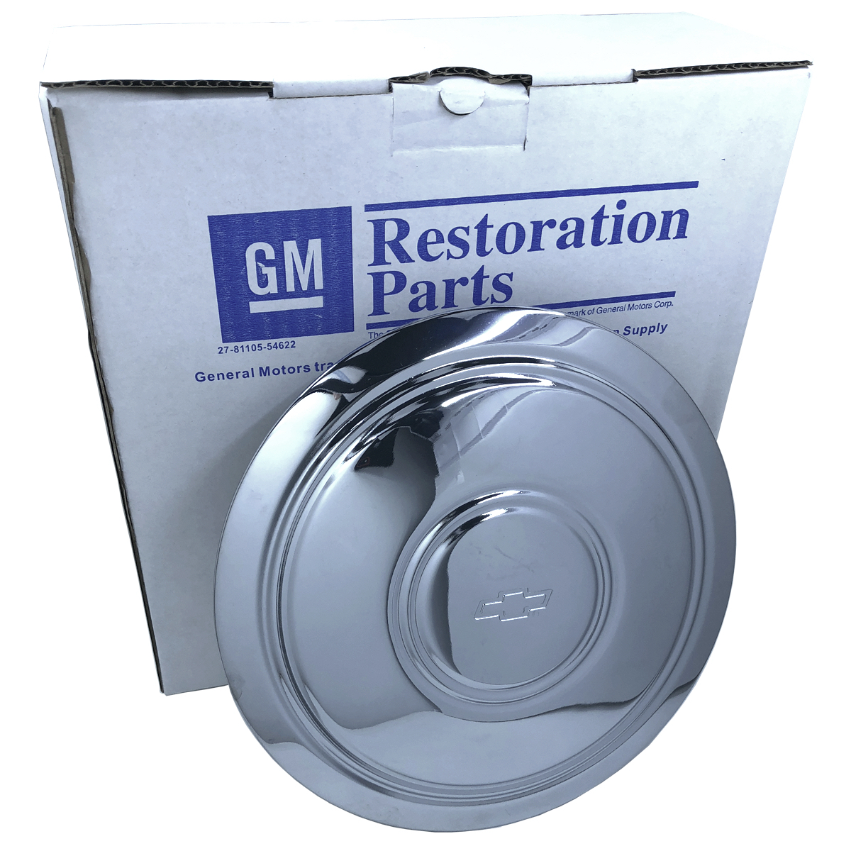This is a pair of two GM Restoration Parts chrome Ralley wheel police style center caps. These Chevy Bowtie caps are manufactured specifically for 14 inch and 15 inch Rally wheels and are compatable with many Corvette, Camaro, Chavelle, Nova and Impala models. These Chrome plated stainless steel center caps are boxed in an original Chevrolet GM Restoration tradmarked package and have the bowtie impression recessed in the center. The outside diameter is 8.1" wide while the inside diameter accomodates the Ralley wheel inner nubs on inside of the center of the wheel.