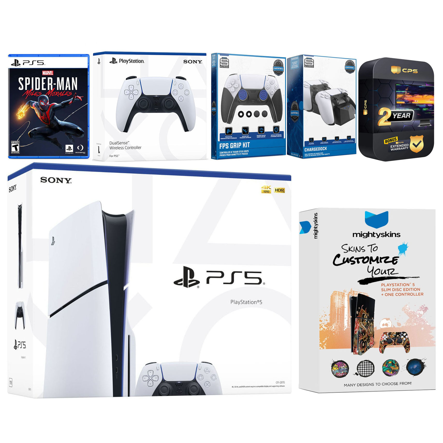 Sony PlayStation 5 Slim Digital Console, 2x Dualsense Controllers, Marvel’s Spider-Man: Miles Morales Physical Game, FPS Grip Kit with Precision Aiming Rings, Charge Dock, MightySkins Code, HDMI cable, AC power cord, USB cable, and Warranty