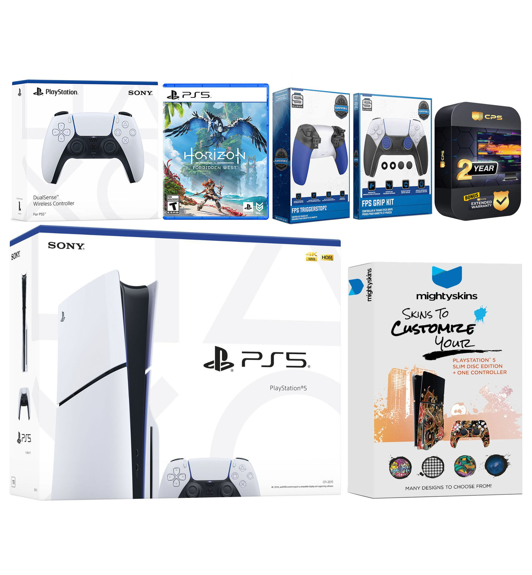 Sony PlayStation 5 Slim Digital Console, 2x Dualsense Controllers, Horizon Forbidden West Physical Game, FPS Grip Kit with Precision Aiming Rings, FPS Trigger Kit, MightySkins Code, HDMI cable, AC power cord, USB cable, and Warranty