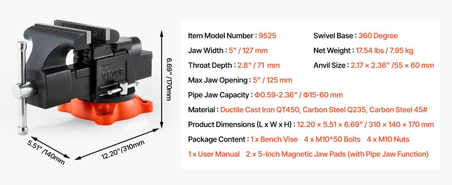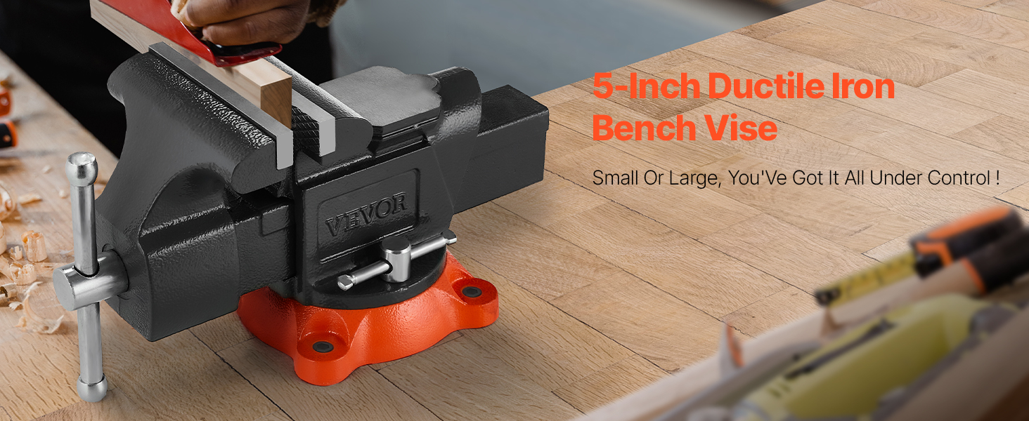 Made of ductile cast iron, our bench vise features a 360° rotating base, allowing you to work from any angle. 5" jaw width and 5" jaw opening for clamping small or large materials, and 2.17" x 2.36" anvil offers a solid platform. Get a secure grip on round pipes with pipe jaws.
