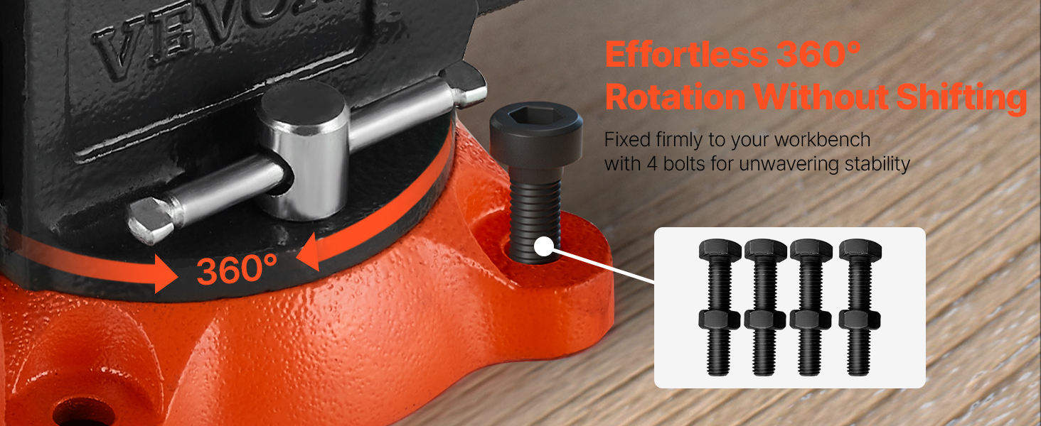 Rock-Solid Mounting Design: Built for tough jobs, our rotating bench vise features a robust 4-bolt mounting design that delivers superior stability. It ensures a secure hold, even under intense pressure, allowing you to focus on what matters most—getting the job done. Get the power to tackle any project with confidence!