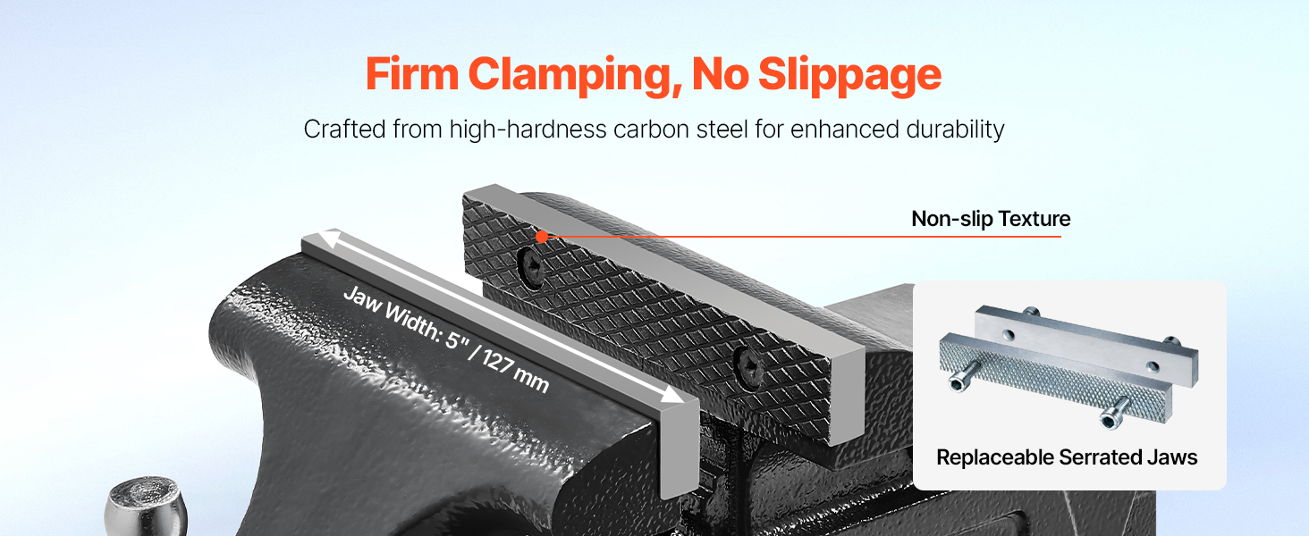 Featuring high-hardness carbon steel jaws, this multipurpose bench vise boasts excellent wear resistance, even under heavy, continuous use. The jaws will hold up over time, minimizing the need for replacements and reducing maintenance costs.