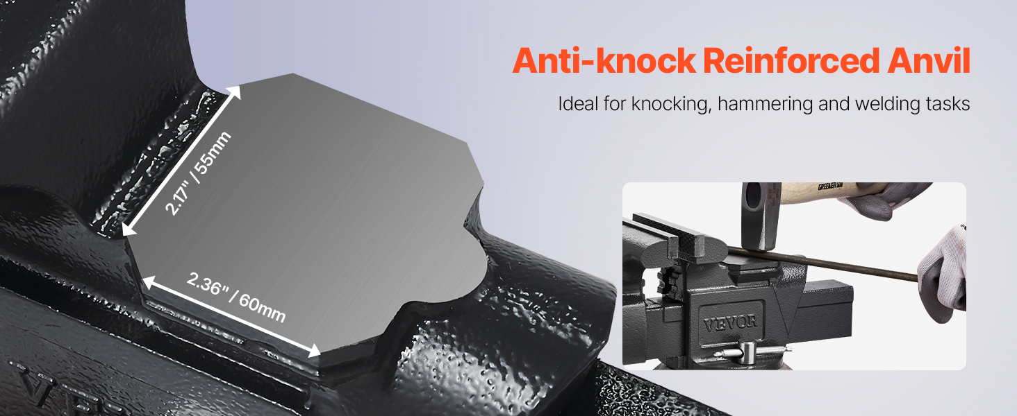Wide Jaw Opening, Large Anvil: Featuring a 5" (127 mm) jaw width and a 5" (125 mm) max jaw opening, this multipurpose bench vise easily accommodates a variety of workpieces, ensuring a secure hold for any tasks. Plus, with a 2.17 x 2.36" (55 x 60 mm) anvil surface, you get the ideal platform for hammering, bending, and other heavy-duty tasks.