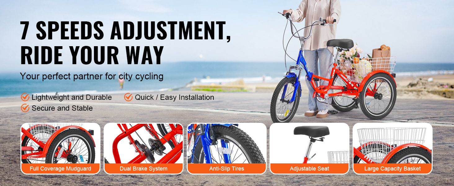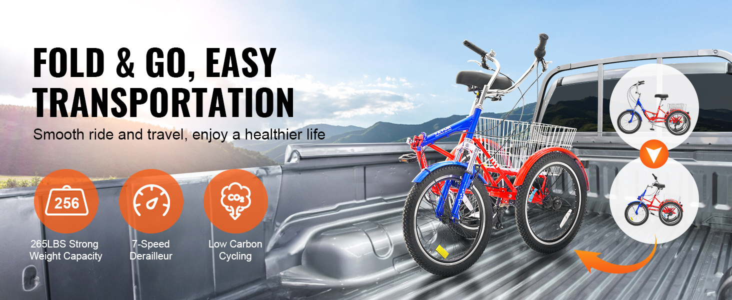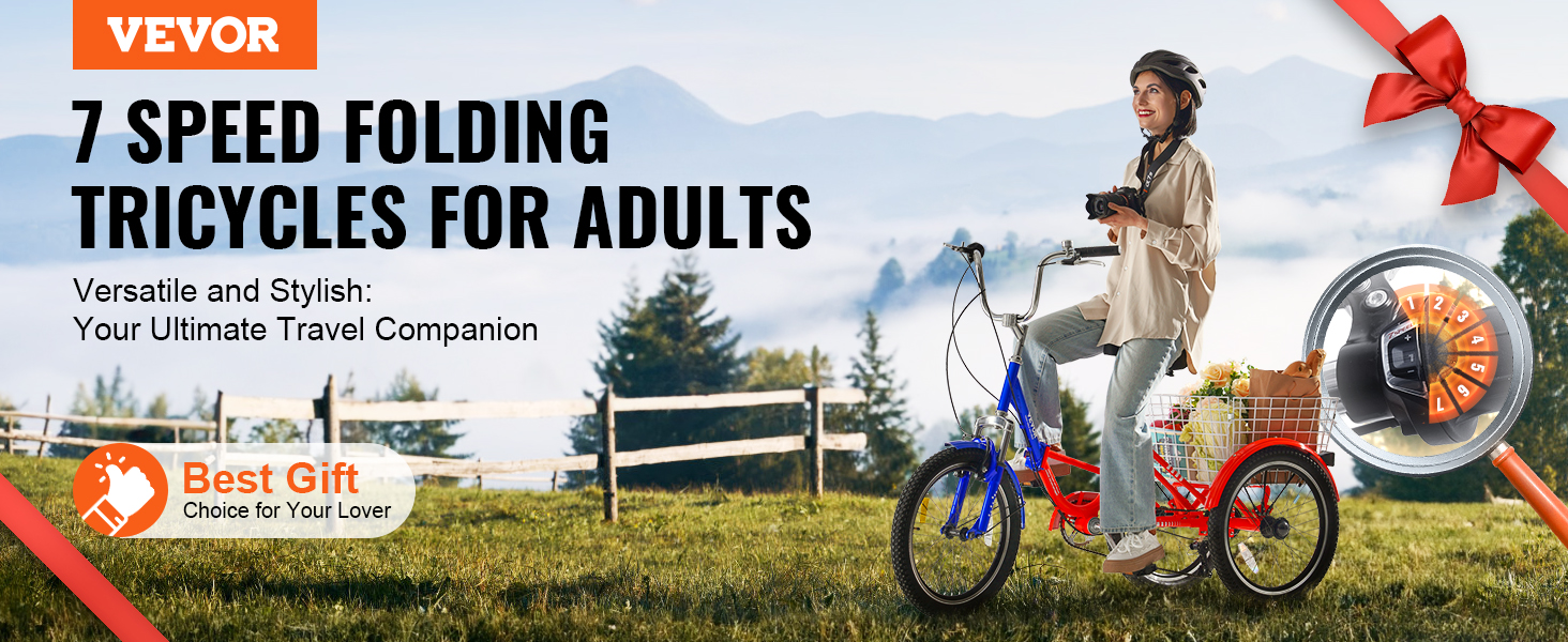 VEVOR 20-inch 7-Speed Foldable Adult Tricycle: Your companion for convenient and enjoyable travels! With foldable structure, sturdy frame, 7 speed adjustment and comfortable riding, it's the perfect choice for commuting, shopping, or picnics, making it your ultimate companion for healthy travels.