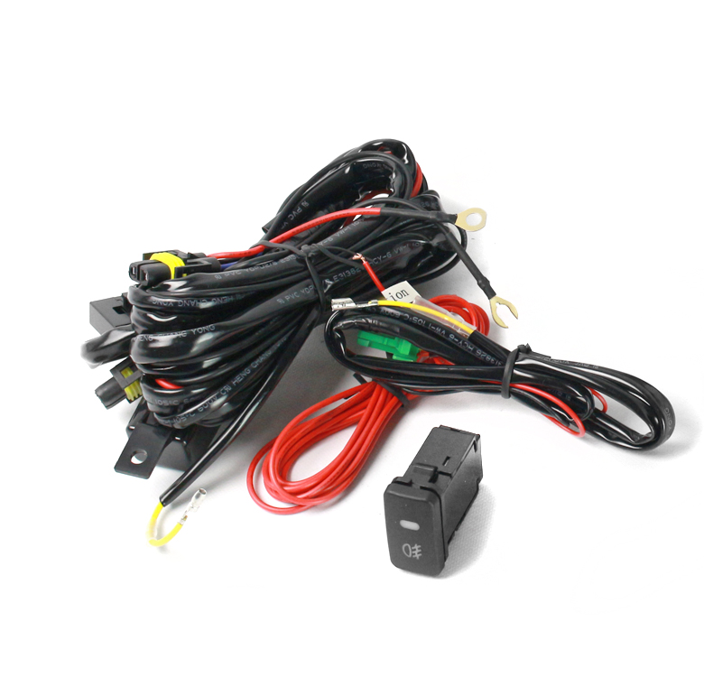 A pair of fog lights (driver and passenger side), wiring harness, and switch