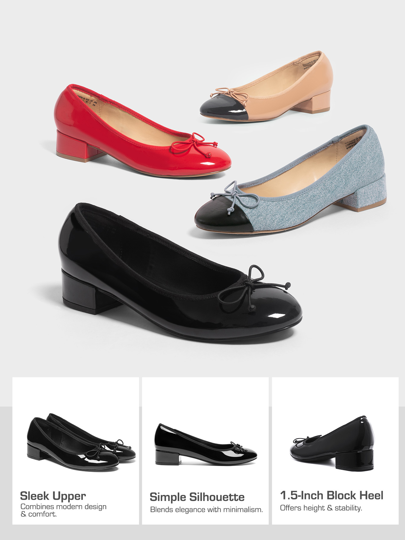 Crafted with a vegan patent leather upper, these ballet pumps exude sophistication while embracing eco-friendly fashion. The synthetic lining ensures a soft and smooth feel against your skin, guaranteeing long-lasting comfort. With a cushioned insole, these ballet pumps provide the perfect balance of support for busy days. Elevate your look with the block heel, offering just the right height, stability, and comfort in every step.
