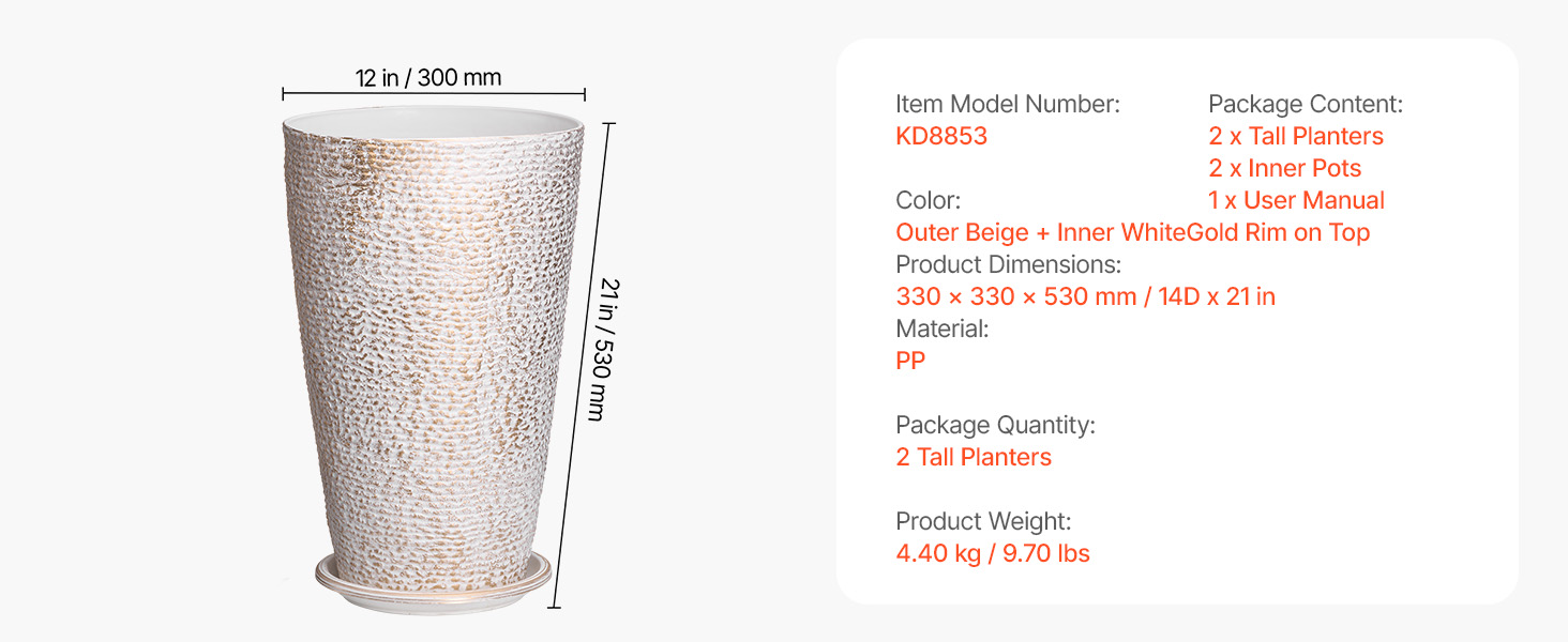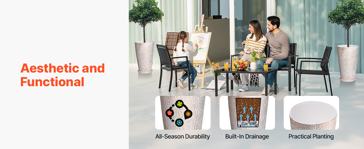 - Durable PP Material: Crafted from sturdy PP material, this tall outdoor planter is designed to withstand harsh weather conditions like sun exposure and wind while avoiding fading and cracking. Made for outdoor use, it delivers long-lasting reliability and style while being recyclable - an ideal choice for eco-conscious users.