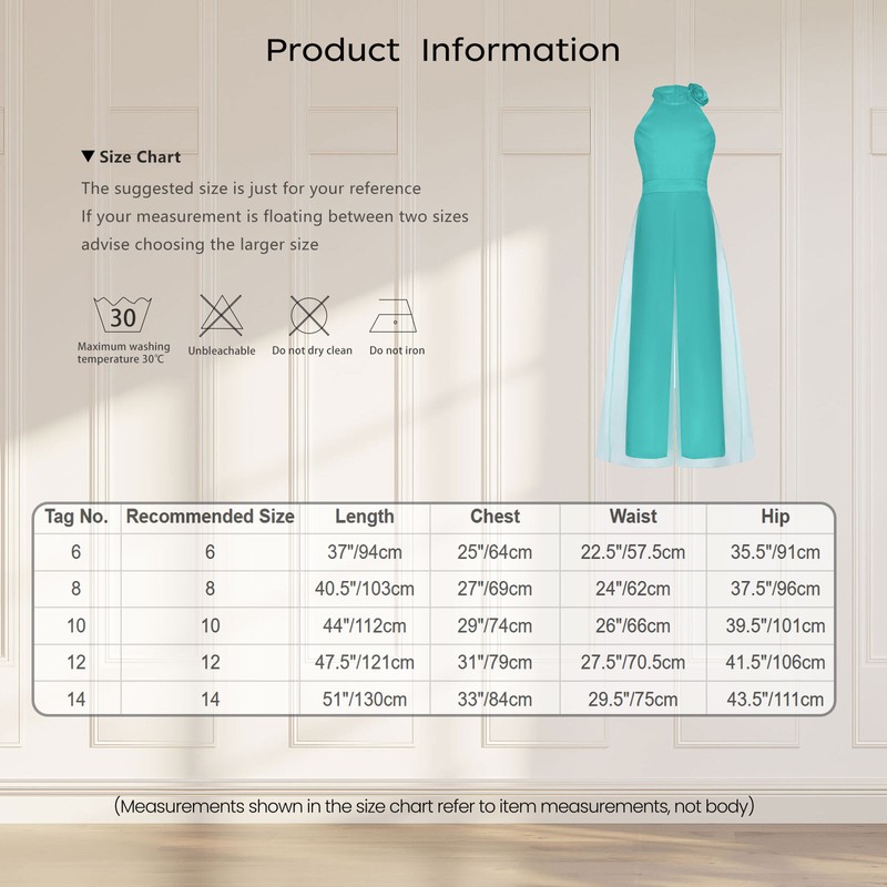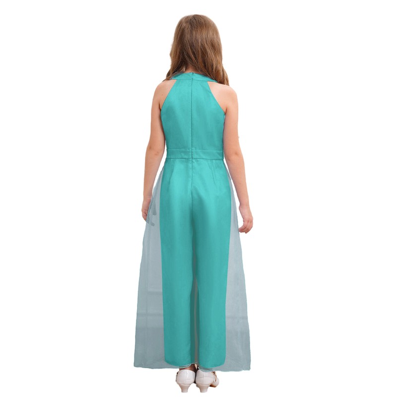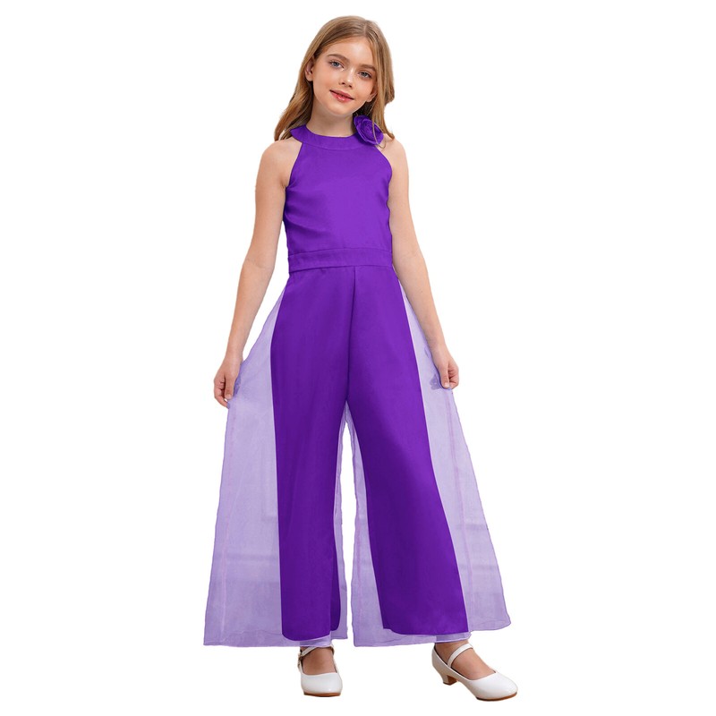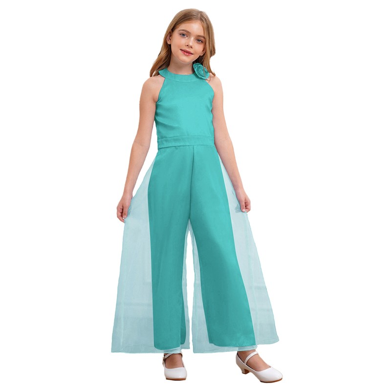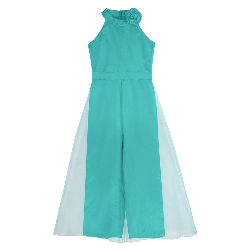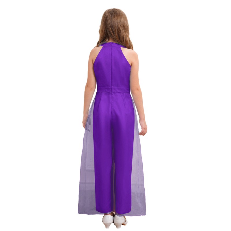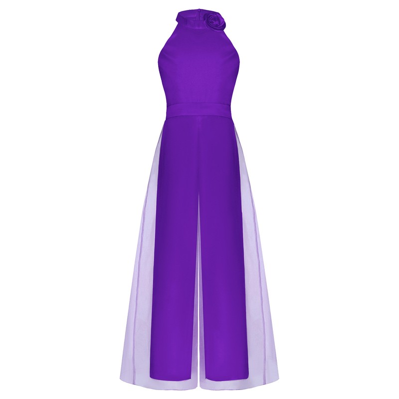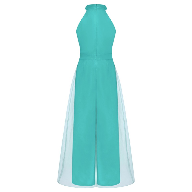 Design with halter neck, sleeveless, tulle layer and smooth lining, wide leg pants, back zipper closure; matched with a brooch.