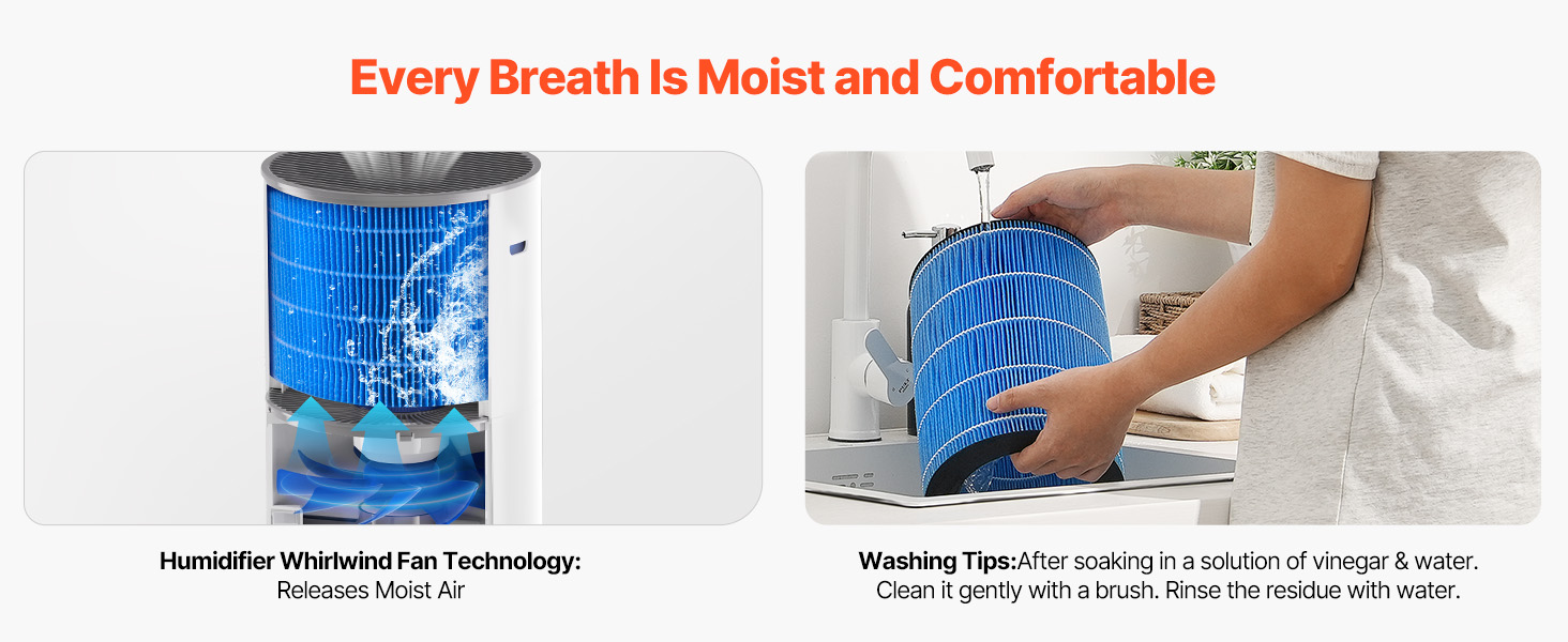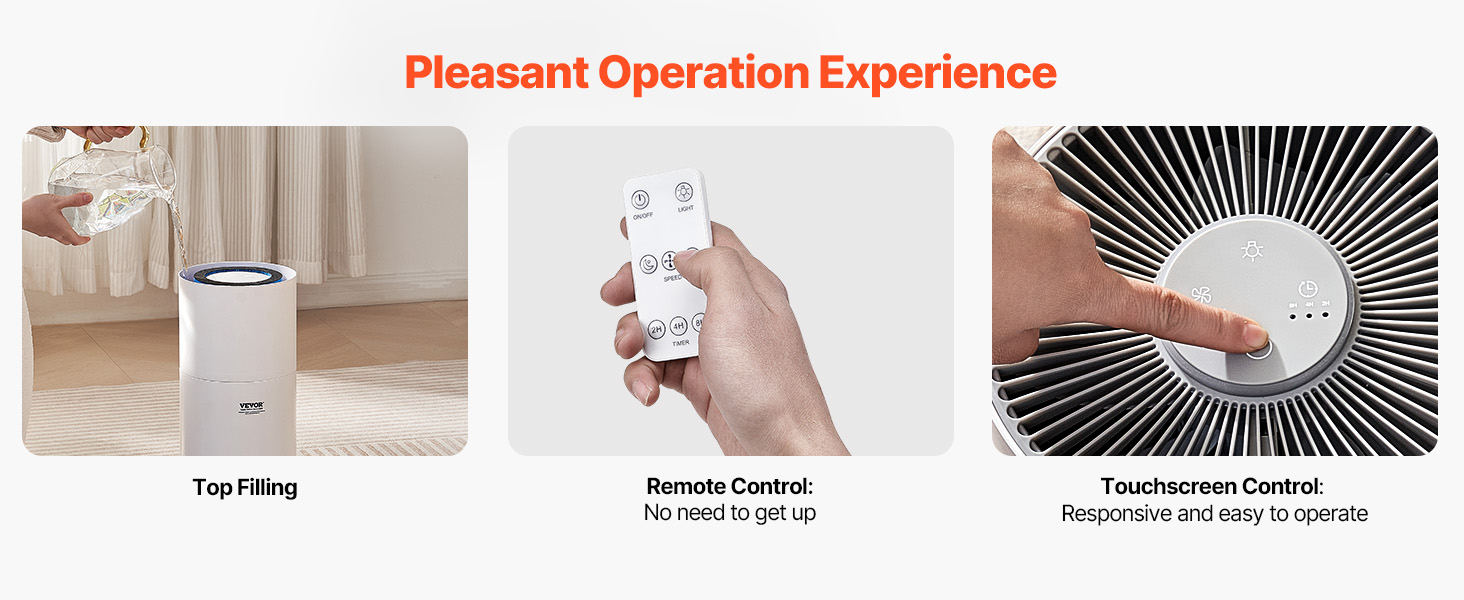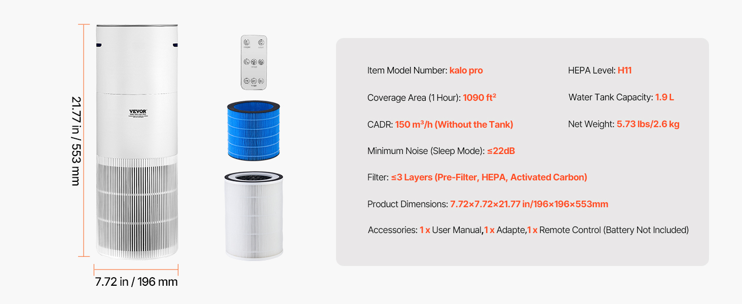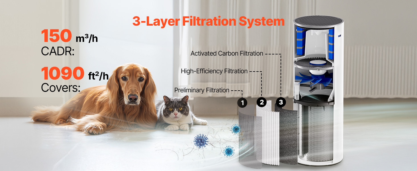 This air purifier covers 1090 ft²/h with a CADR of 150 m³/h. With HEPA and activated carbon filters, it captures pet dander, smoke, and dust. Auto mode adjusts fan speed, and it can be used as a purifier alone or with humidification. The 1.9 L water tank provides natural evaporation for fresh air.