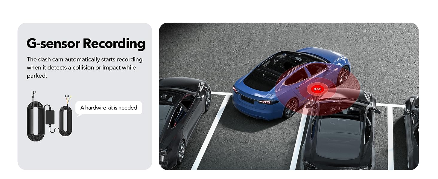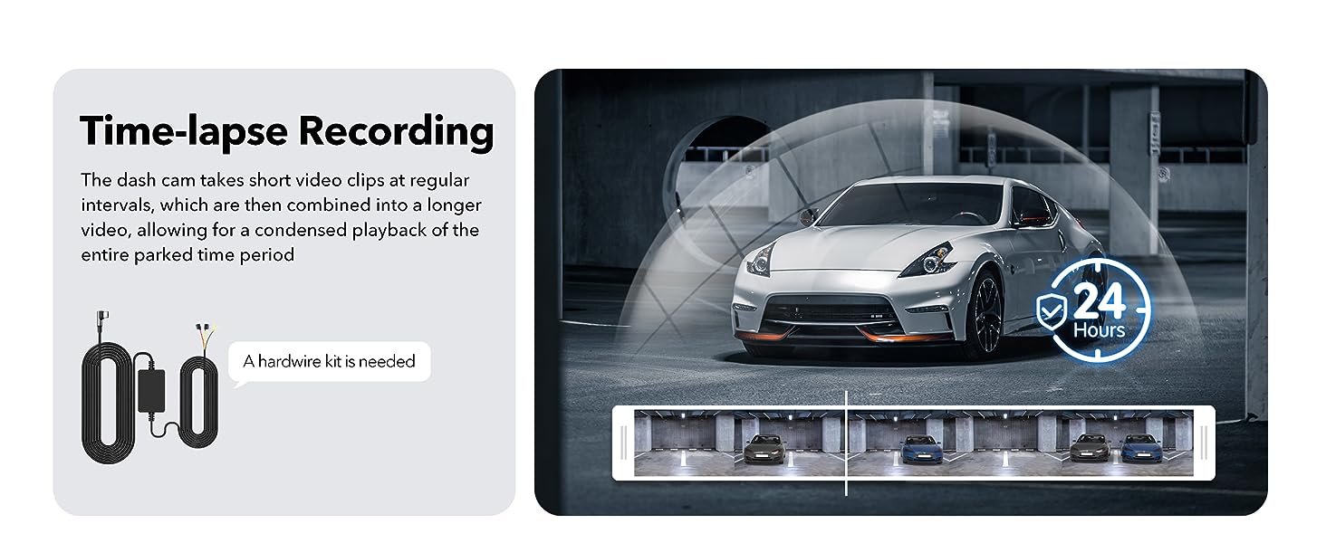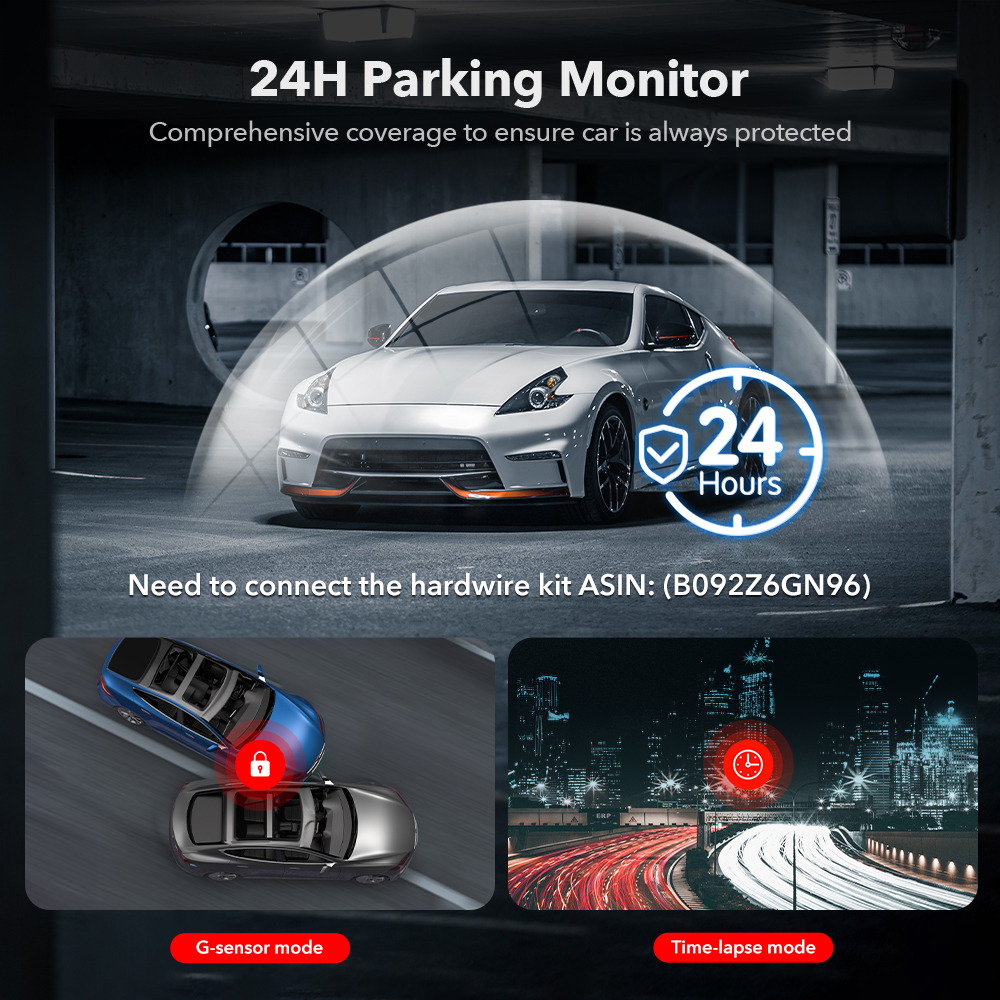[24-hour Parking Monitoring]car dashboard offers G-Sensor Parking Mode automatically activates recording when it detects any impact or sudden motion while vehicles is parked. Time Lapse Parking Mode continuous surveillance by offering a condensed overview of any events that may occur during extended parking periods.Please note that the parking monitoring function requires the purchase of a separate hardwire kit.