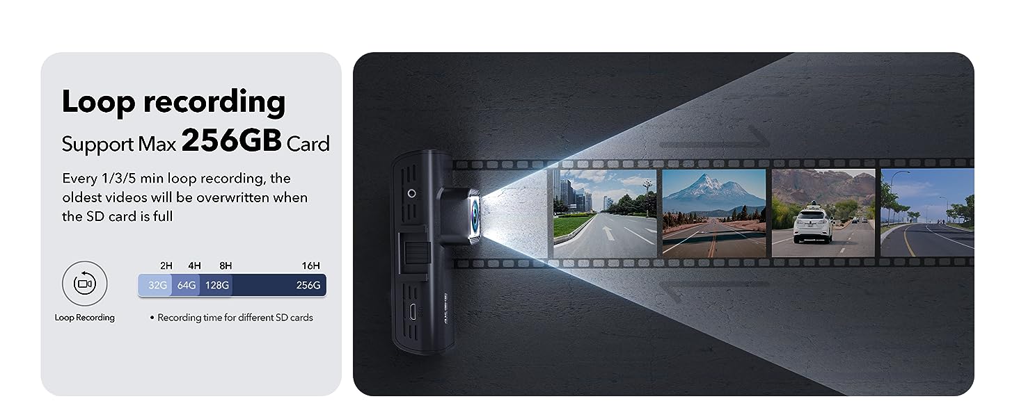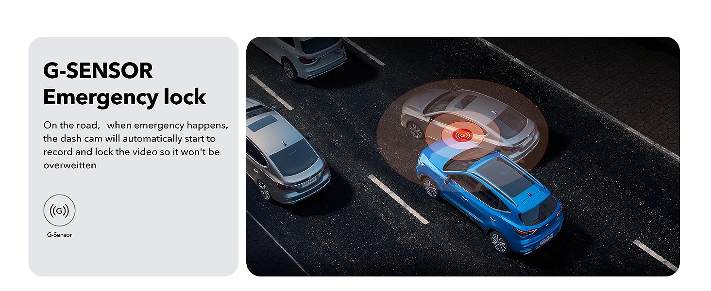 [Loop Recording&G-Sensor]Dash Cam automatically overwrites the oldest footage when the memory card is full, ensuring continuous recording.car camera is equipped with a built-in G-sensor that detects sudden movements or impacts. When an event is detected on the road, it automatically locks and protects the associated footage, ensuring that it won't be overwritten during loop recording.