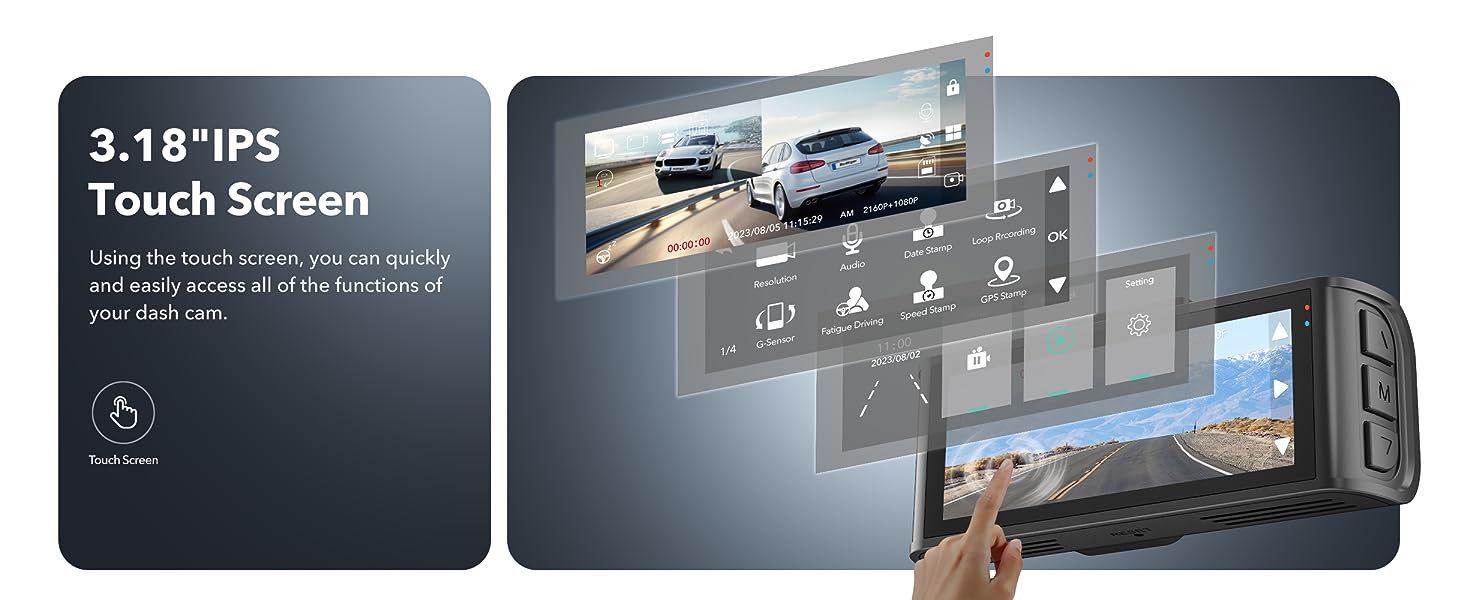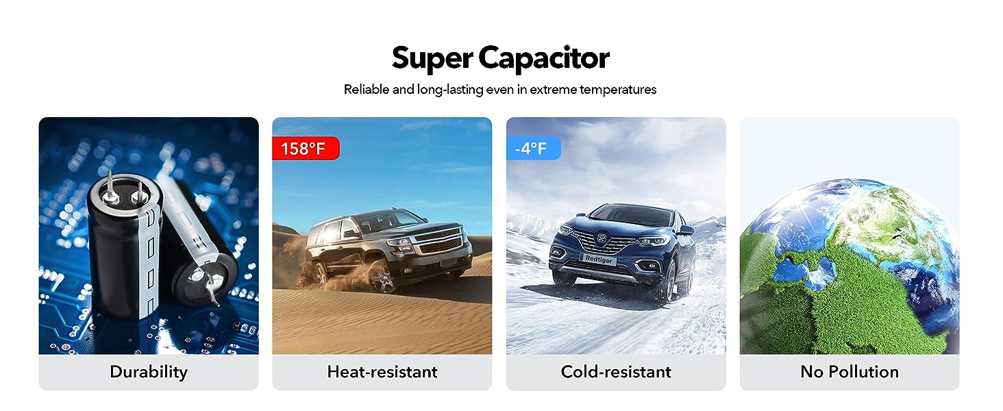 [Upgraded Touch Screen] Using the touch screen, you can access all of the features of your dash camera for cars including video recording, playback, and settings. car cams with the super capacitor is designed to withstand a wide range of temperature fluctuations. Whether it's scorching hot summers or freezing winters, the super capacitor ensures optimal performance and longevity.