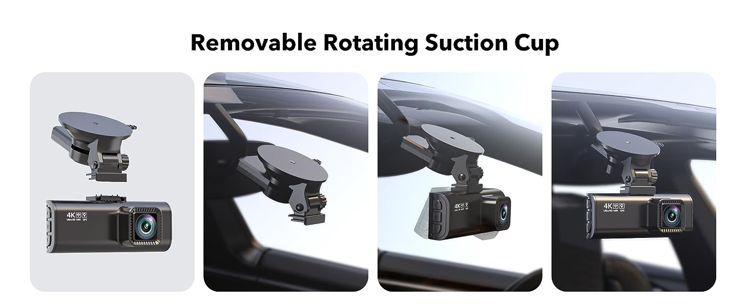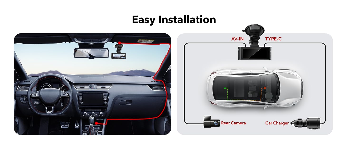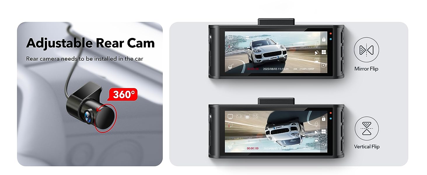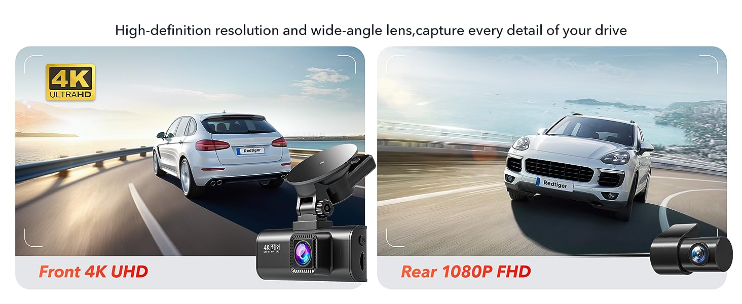 [4K+1080P Dual Recording] Capture your drive journey in stunning 4K resolution 170 degree wide-angle view lenagel for the dash cam front and 1080P resolution 140°wide-angle for the rear car camera. Dashcam with WDR technology, the enhanced super night vision ensures visibility even in low-light situations, providing you with reliable recordings day and night.