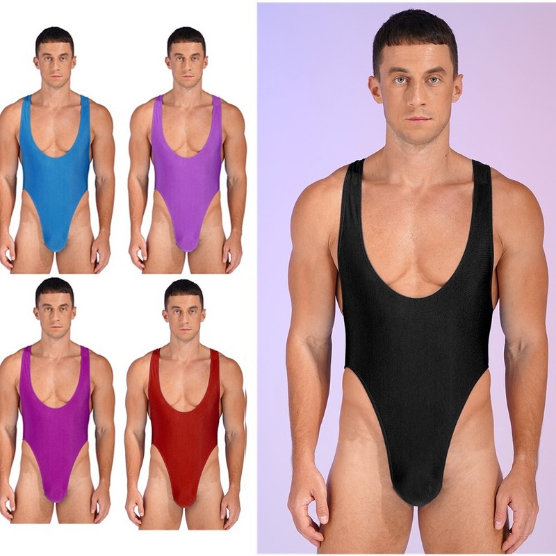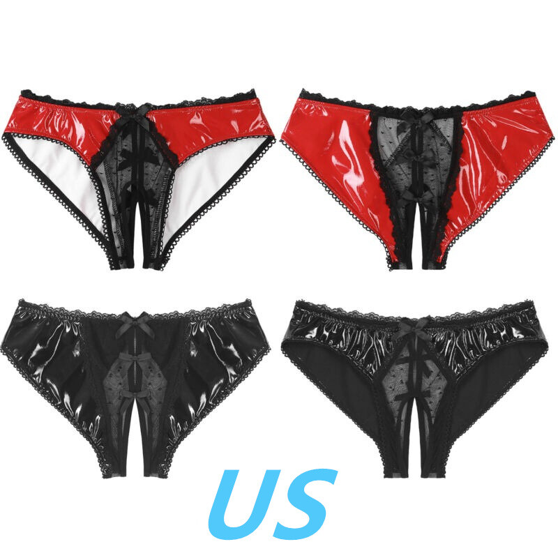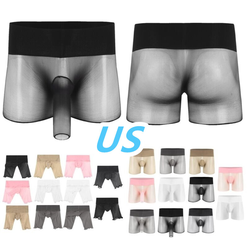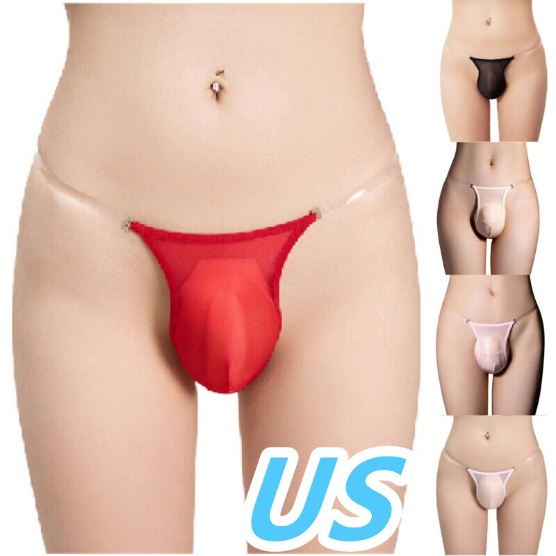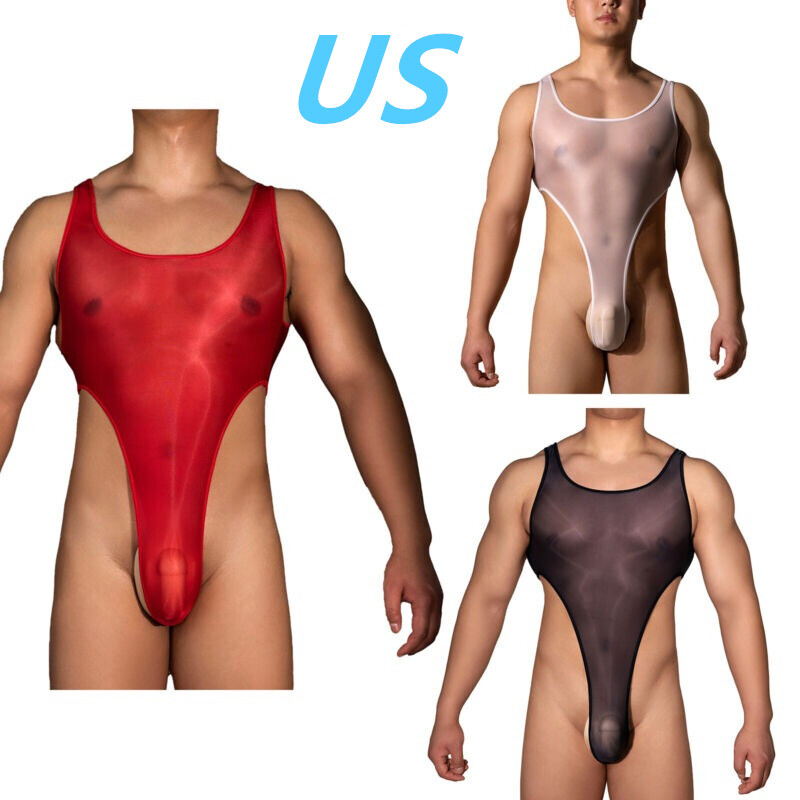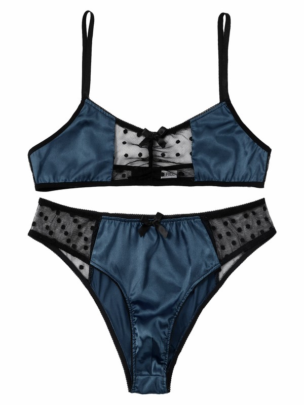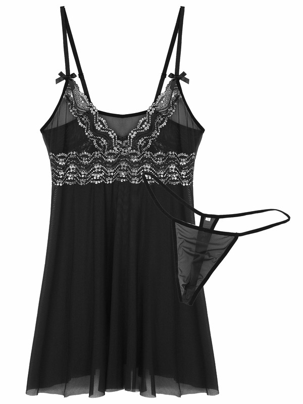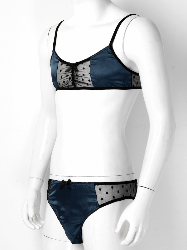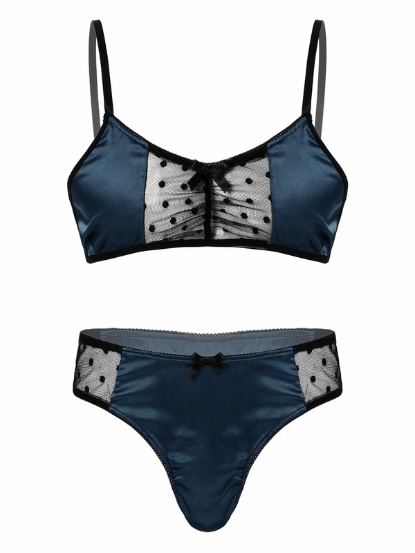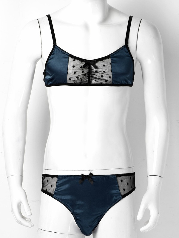 Men Satin Lingerie Suit Sissy Nightwear Sheer Mesh Patchwork Adjustable Spaghetti Strap Bra Tops with Briefs Thongs.