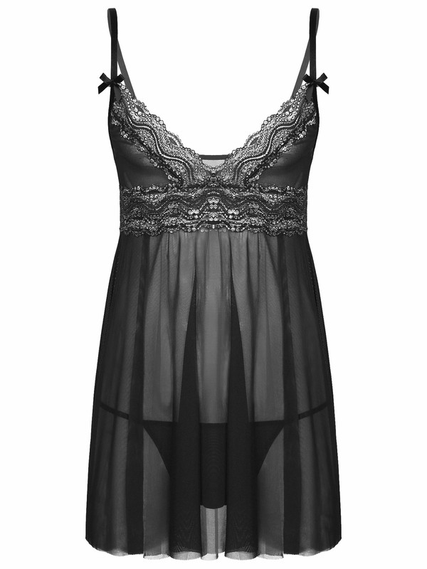 Soft and smooth satin touch feeling, see-through mesh at the front chest and both side of waist, decor with bowknot.