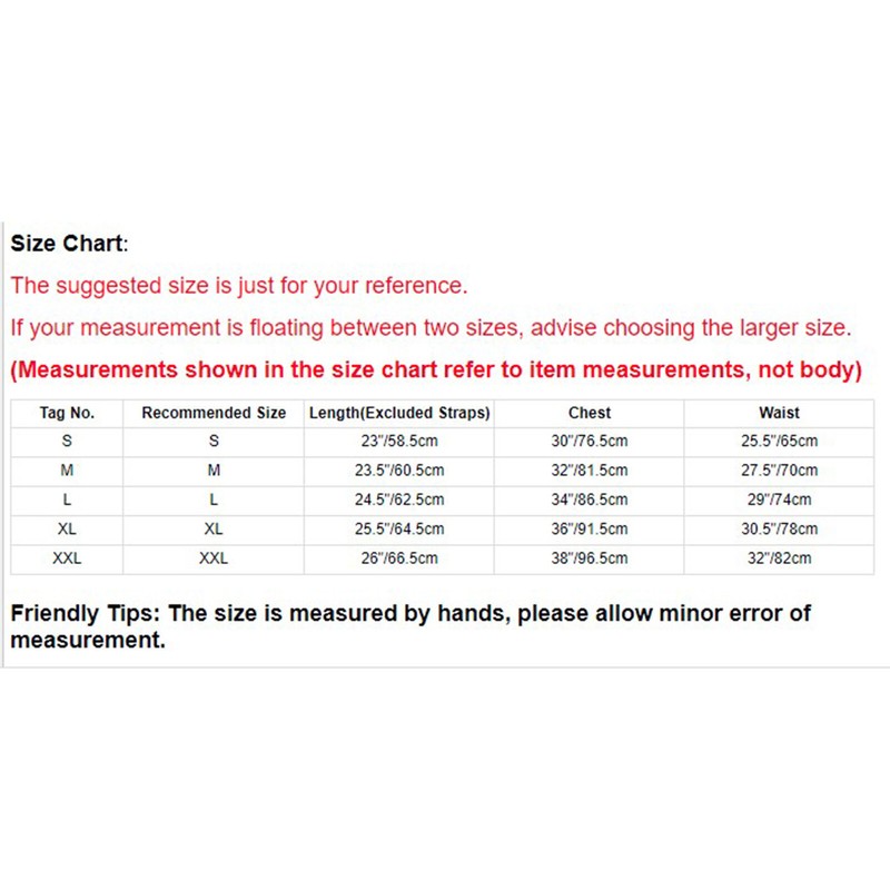 | Tag No. | Recommended Size | Length(Excluded Straps) | Chest | Waist |