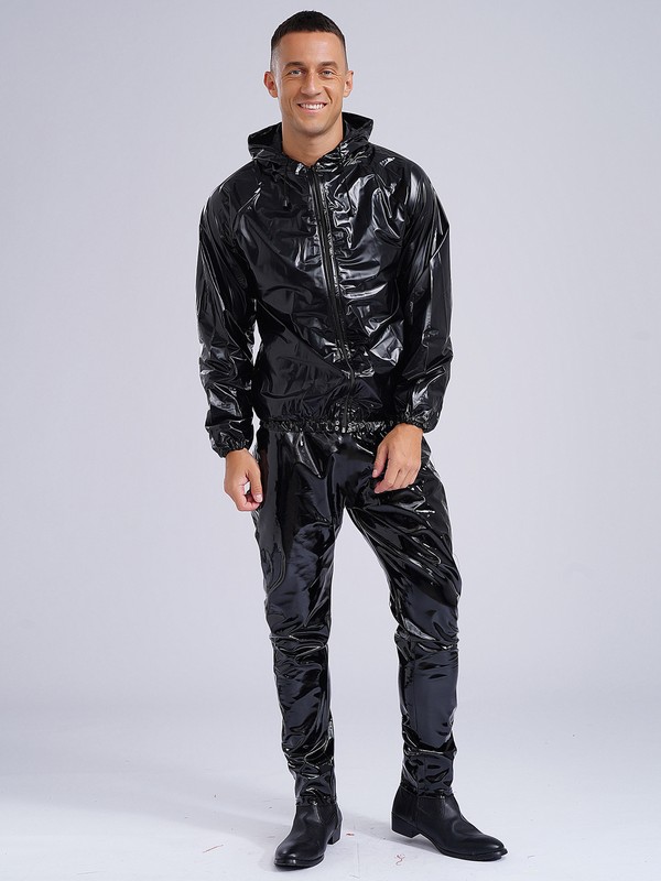 Men's PVC Sauna Suit Weight Loss Sweat Suit Gym Fitness Hooded Jacket and Pants