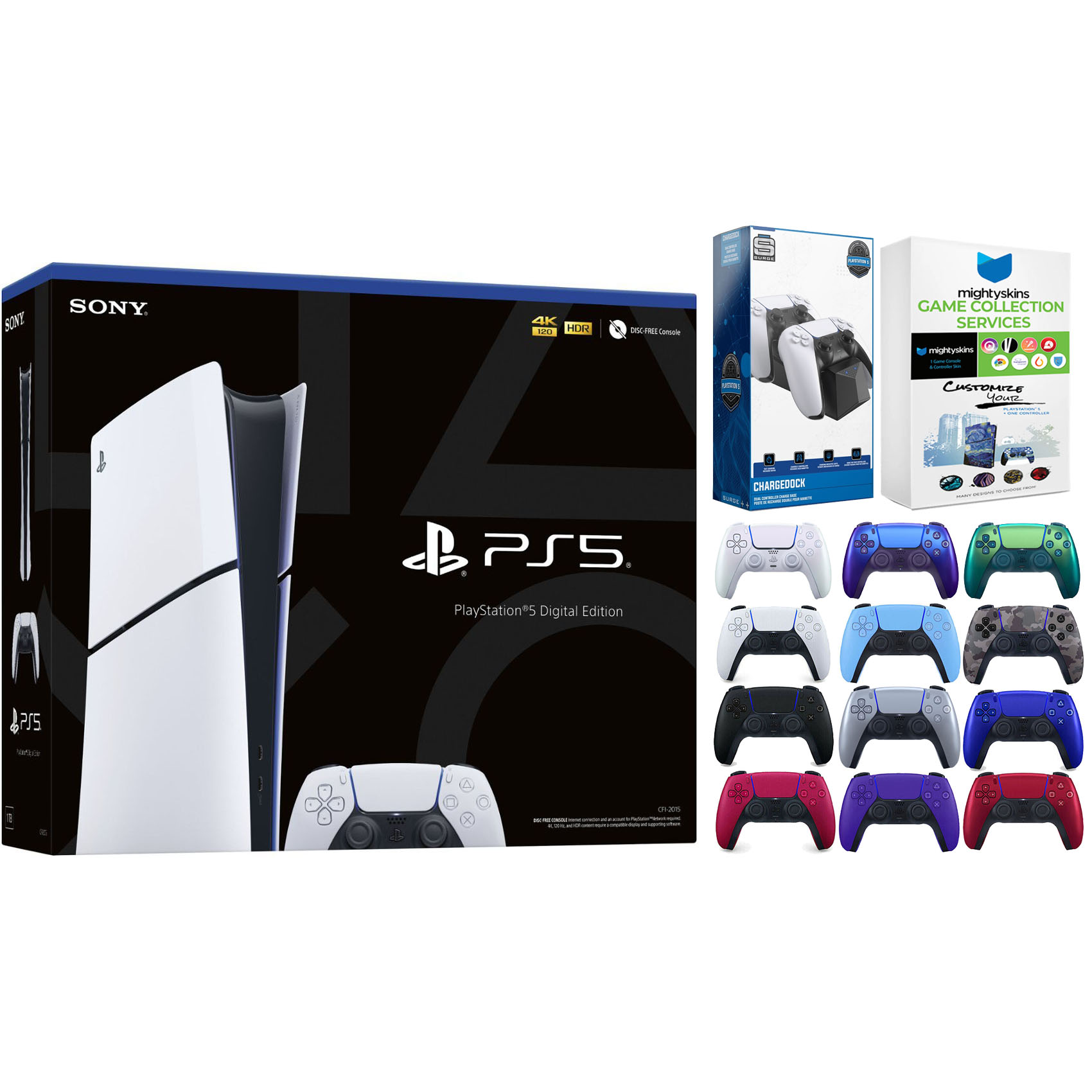 Sony PlayStation 5 Slim Digital Console, 2x Controllers, Dual Charge Dock, MightySkins Game Pack Code, HDMI cable