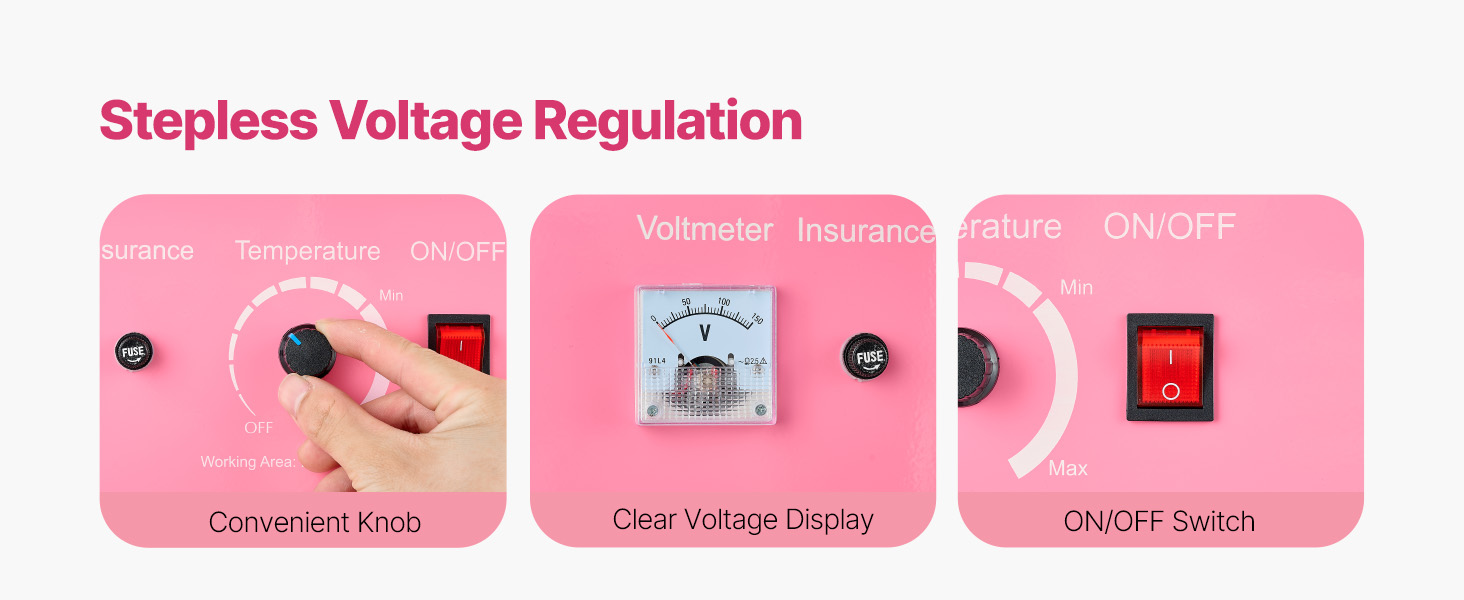 - Temp Control: Unlike the common ones, our electric candy floss maker features a voltage meter and a voltage control knob. By changing voltage, you can simply adjust the temperature. If you want to try different flavored sugars, you will absolutely need this