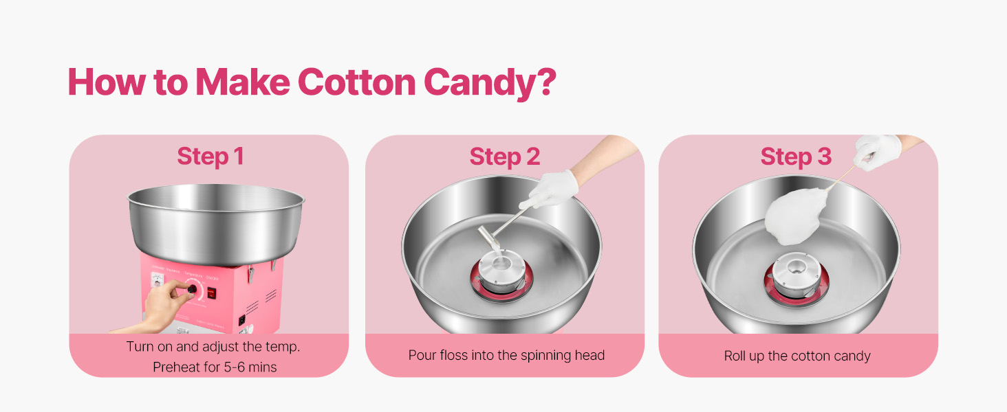 - Easy-Operating Process: Using this machine couldn't be easier. Turn on the power, adjust the voltage, warm up for 2-3 minutes, and pour sugar into the spinning head, and then you just need to use the sticks to collect the cotton candies from the head. Even for the first time, it's easy to make a perfect cotton candy