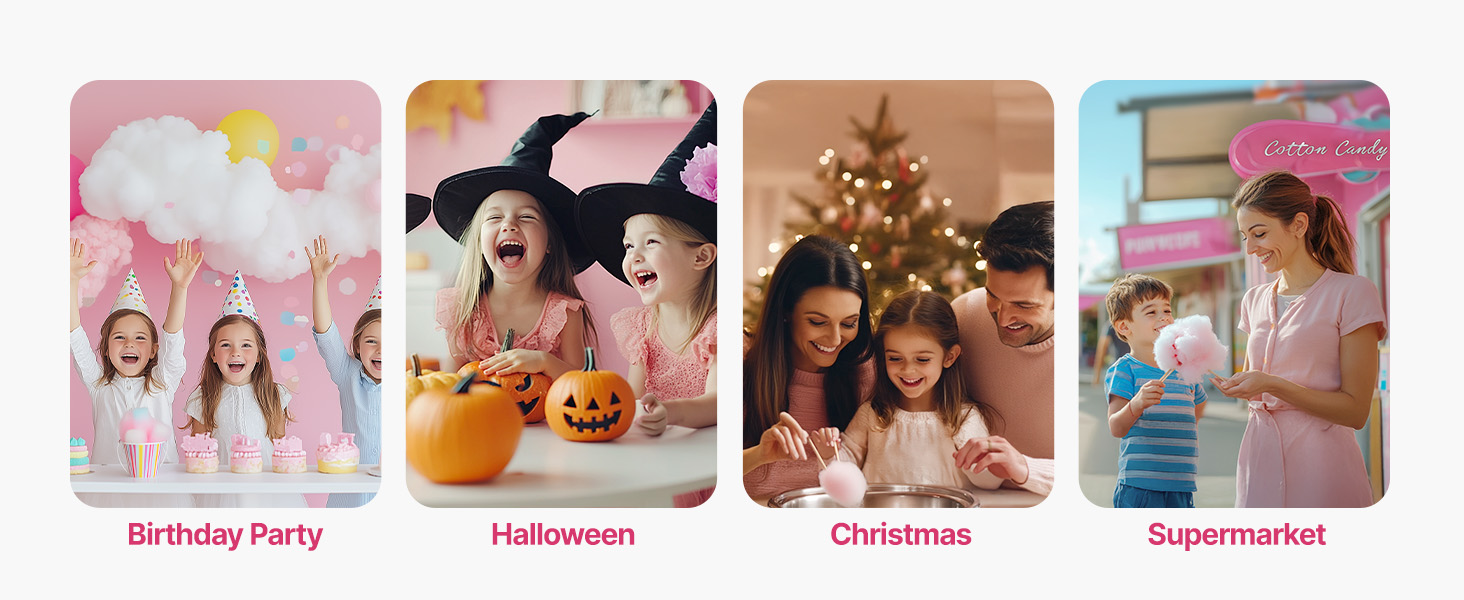 - Work with Any Candy You Like: This cotton machine allows you to use the traditional flossing sugars, milk sugars, fruit cubes, or any of your favorite hard candies to make delicious cotton candies. With a compact size, it is suitable for countertop use, and it is perfect for carnivals, festivals, birthday parties, and sports events