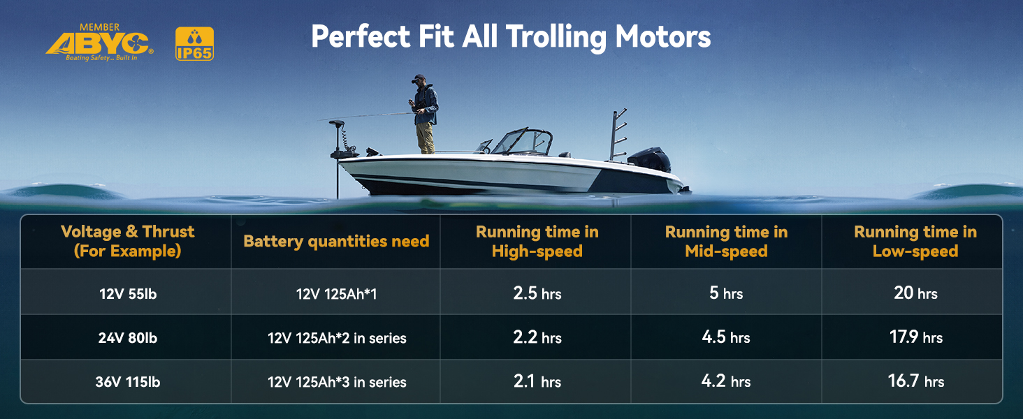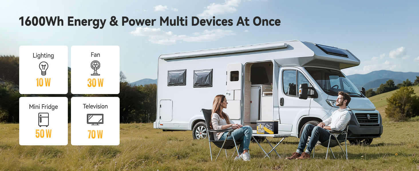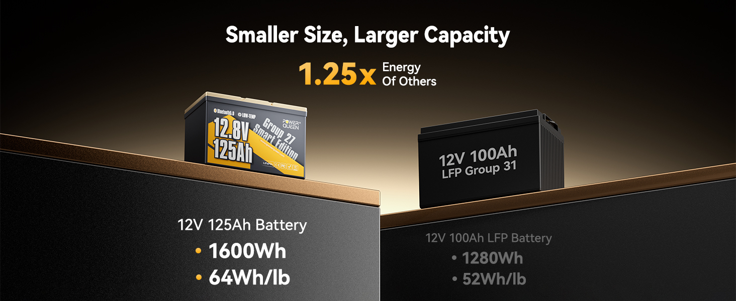 Universal Group27 Fit&Longer Runtime:Power Queen 12V 125Ah lithium battery is designed in a BCI Group 27 size(12.13×6.69×8.31 inches). Compared to the 12V 100Ah lithium battery of the same size, it offers an impressive energy increase of 320Wh, it can run 32 hours longer when powering a 10W lighting lamp. Perfect for RVs like the 2024 Brinkley Model Z 2900, Thor Four Winds 22E, and Forest River Forester. Also an ideal choice for trolling motor,marine,camping, solar systems, home energy storage, and off-grid living.