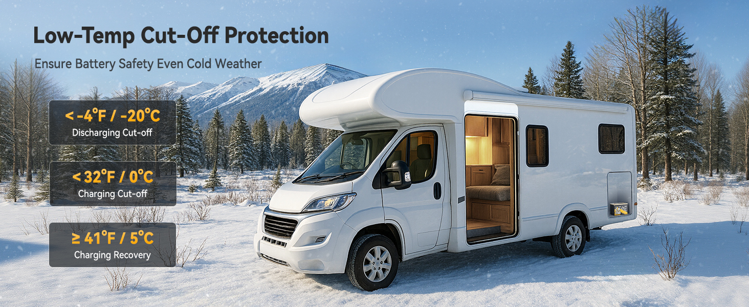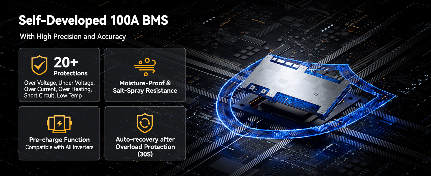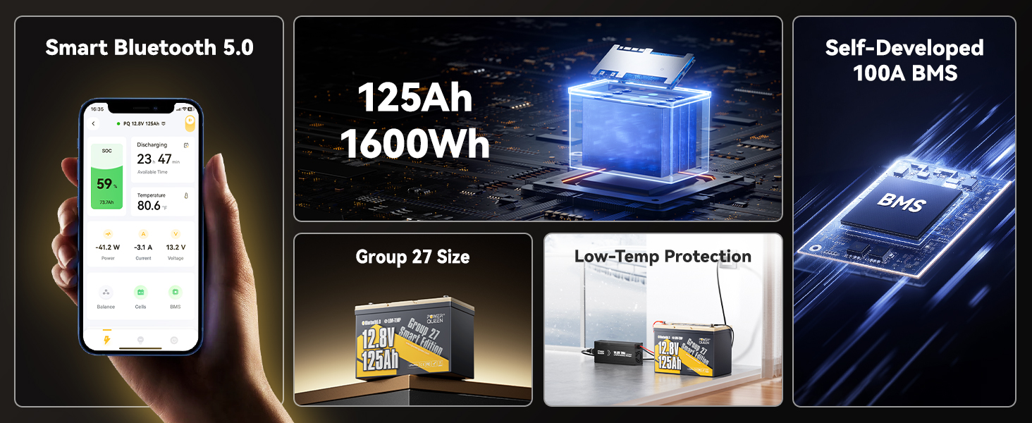 Self-Developed Smart BMS:20+ Protections, Zero Compromise.Power Queen 12V 125Ah LiFePO4 battery adopts self-developed Battery Management System (BMS) with high precision and rapid response. Beyond industry-standard protections against overcharge, over-discharge, overcurrent, short circuit, and overtemperature, it has low-temperature charge/discharge protection,the battery cuts charging<32°F, cuts discharging< -4°F, ensure battery safety even in cold winter conditions. The pre-charge function allows the battery to be compatible with all inverters on the market.Auto-resumes power supply only 30s after overload protection, ensuring safe and stable device operation even in emergency.