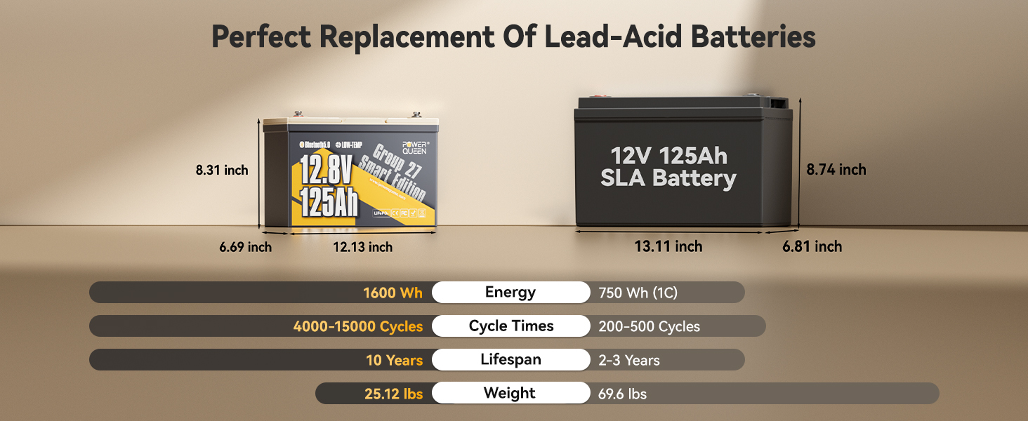 Cost-Effective & 10-Year Hassle-Free:Power Queen's 12V 125Ah lithium battery, built with automotive-grade eco-friendly LiFePO4 cells.One battery can accompany your RV or boat for 10 years, up to 15,000 cycles—far surpassing lead-acid batteries (2-3 years, 200-500 cycles),eliminating the need for frequent replacements.With a energy equivalent to 2.6 units of 12V 100Ah lead-acid batteries,it's a smarter long-term investment for unmatched value and reliability.