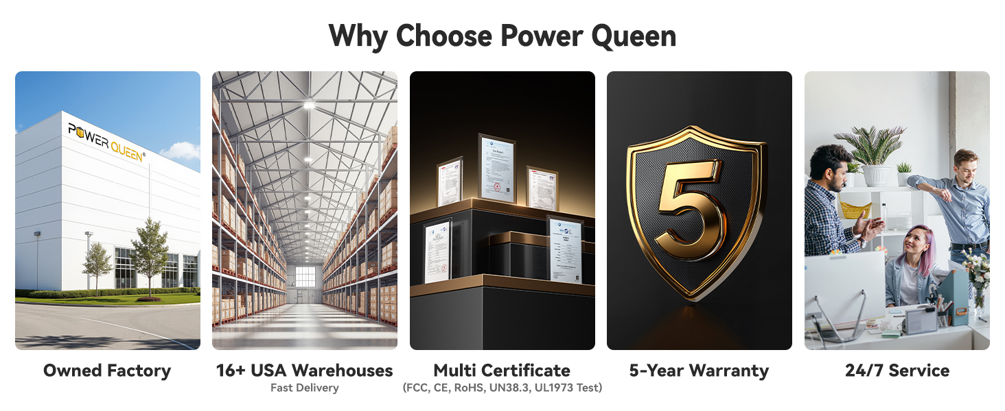 Own Factory and Excellent Customer Service:With our self-owned factory, Power Queen ensures top-tier quality via establishing a full lifecycle management and maintenance system for the products. It holds multi - international certifications (FCC, CE, RoHS, UN38.3) and passes the UL-1973 test, meeting the ABYC standard E-13. Each battery has a unique traceability code and comes with a 5 - year warranty.With 12 U.S. warehouses, we can ship based on actual inventory from the nearest warehouse for fast delivery. We always prioritize customers, offering 24/7 all-round service, including product consultation, technical support, and after-sales service.