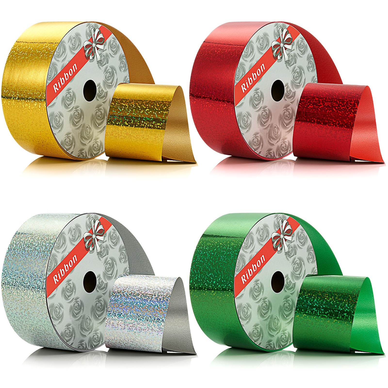 Features: This ribbon is suitable for floral arrangements and project involving water, so it may be applied to outside. This ribbon for gift wrapping is incredibly thin and lightweight, making it easier to embellish gifts. It is easy to shape and bend into a variety of shapes. Specifications: Material: plastic Color: green, silver, red, gold Size: Ribbon width: 4.8 cm/2 Inch Each Ribbon length: approx. 50 yards Package includes: 4 Rolls of Christmas ribbon Notes: Manual measurement, please allow slight errors on size. The color may exist a slight difference due to different screen displays.
