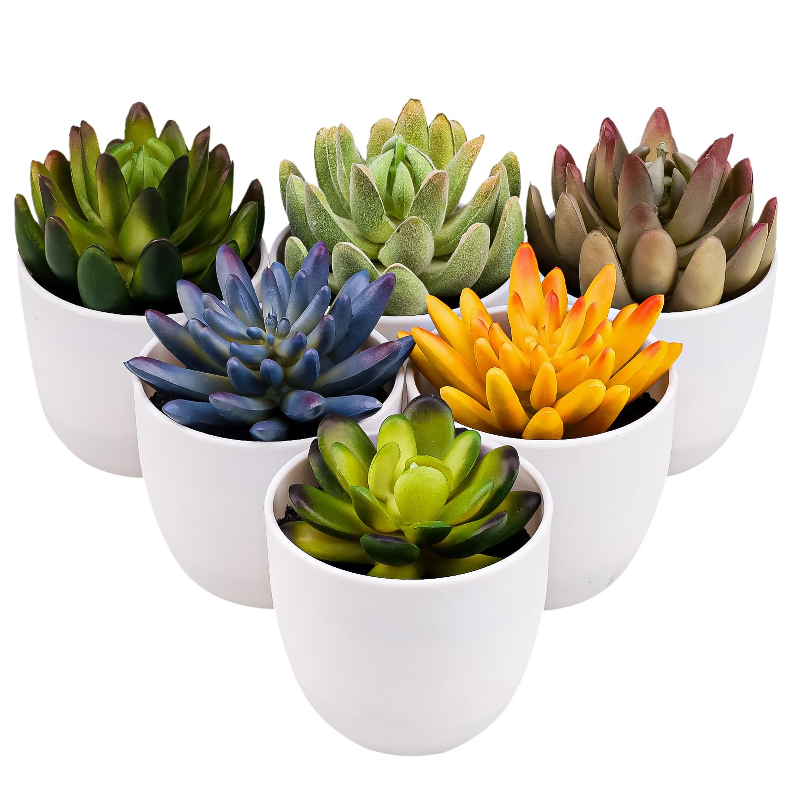 Artificial Succulents Plant: You will receive 6 mini fake succulents plant decorations with white plastic pots, 3.93 inches/10 cm high. Faux aloe and lotus landscape potted ornaments have natural colors, exquisite details, and look very realistic.