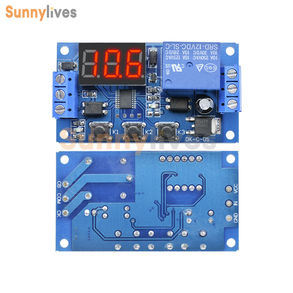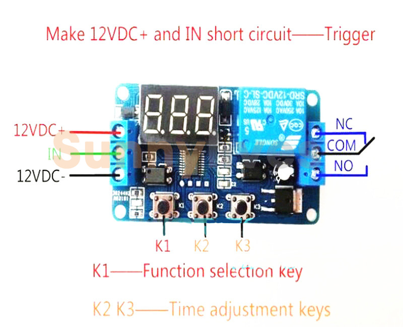 P1-2 operating modes: Asignal trigger, digital countdown begins, X seconds after, there lay open Y seconds, then close. Users can set the relay time X,Y; P1-1different time settings similar to the blue lights that set the relay time, blue light indicates setting relay off time. Short press K1, enter function offine-tuning the set, the default trigger is invalid during the delay, press K1, during the delay trigger active (re-timing), then click the first repeat default settings.