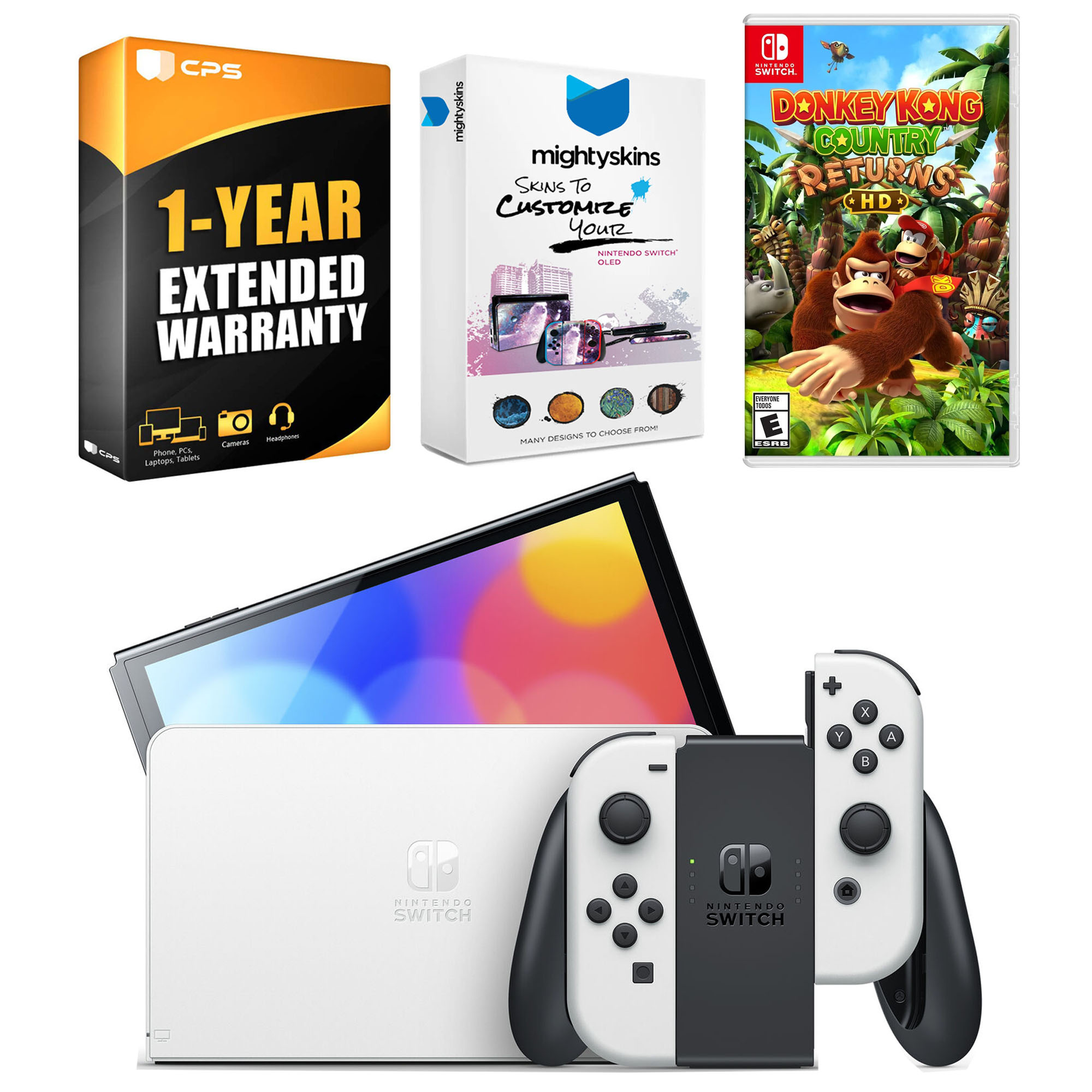 INCLUDED: Nintendo Switch OLED Console, Nintendo Switch OLED Dock, Donkey Kong Country Returns HD game, Left & Right Joy-Cons, Joy-Con Wrist Straps, Joy-Con Grip, High speed HDMI Cable, Nintendo Switch AC Adapter, MightySkins Voucher, and 1 Year CPS Extended Warranty