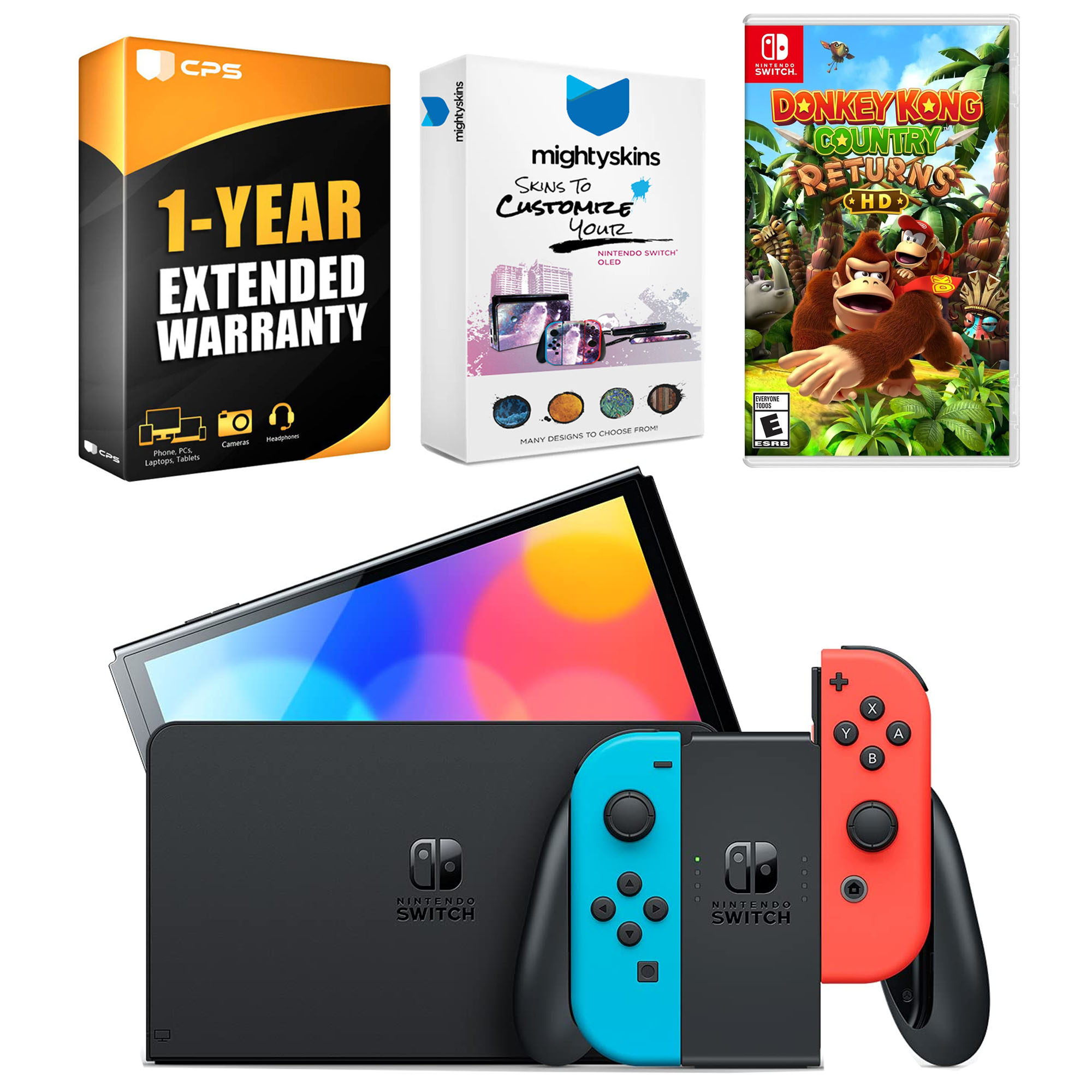 INCLUDED: Nintendo Switch OLED Console, Nintendo Switch OLED Dock, Donkey Kong Returns HD game, Left & Right Joy-Cons, Joy-Con Wrist Straps, Joy-Con Grip, High speed HDMI Cable, Nintendo Switch AC Adapter, MightySkins Voucher, and 1 Year CPS Extended Warranty