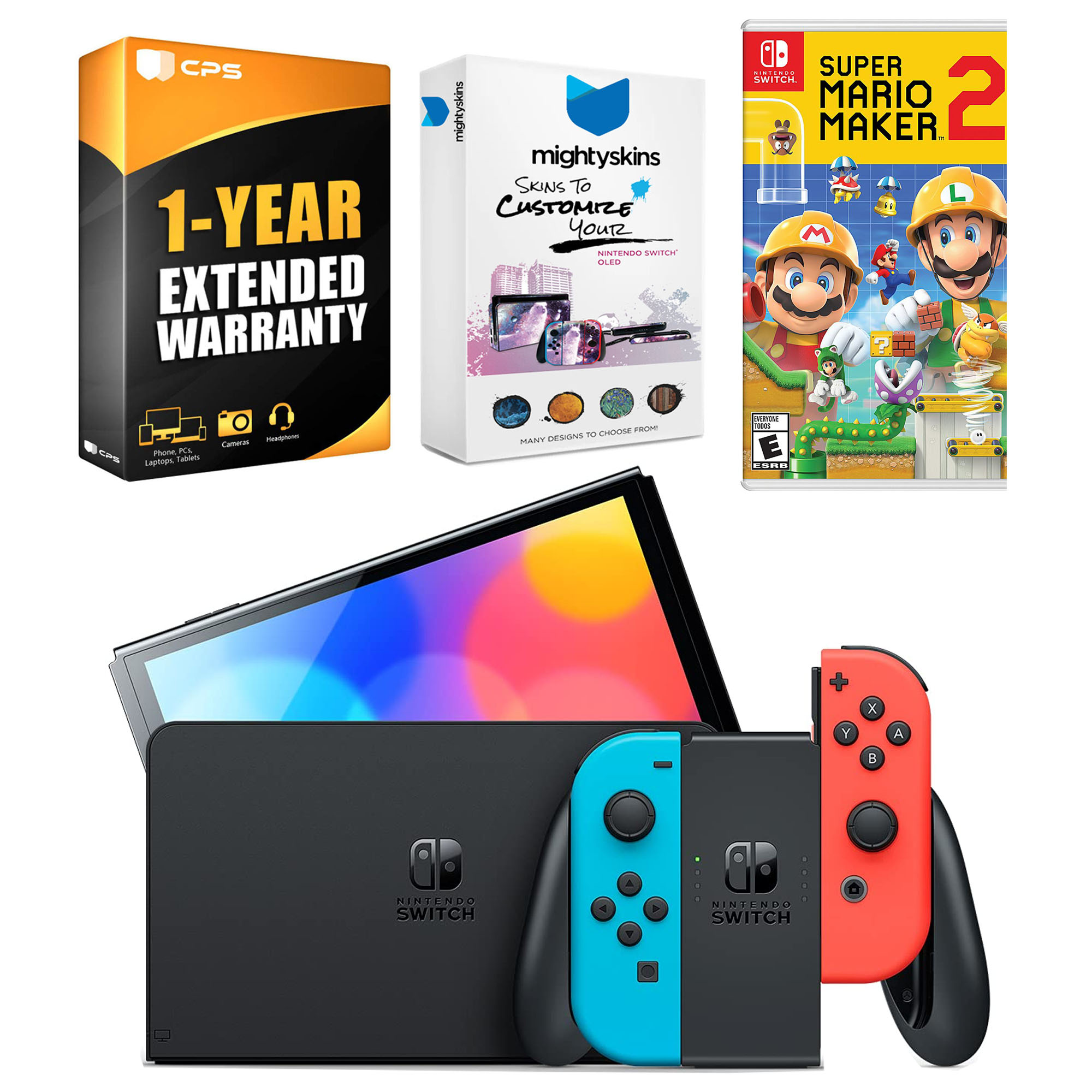 INCLUDED: Nintendo Switch OLED Console, Nintendo Switch OLED Dock, Mario Maker 2 game, Left & Right Joy-Cons, Joy-Con Wrist Straps, Joy-Con Grip, High speed HDMI Cable, Nintendo Switch AC Adapter, MightySkins Voucher, and 1 Year CPS Extended Warranty