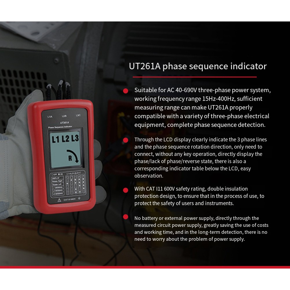 *Anwendung auf AC 40-690V dreiphasiges Stromsystem, Betriebsfrequenzbereich von 15 Hz bis 400 Hz, ausreichender Messbereich ermöglicht dem UT261A eine reibungslose Kompatibilität mit verschiedenen dreiphasigen Elektrogeräten im Energiebereich und vollständige Phasenfolgemessung.