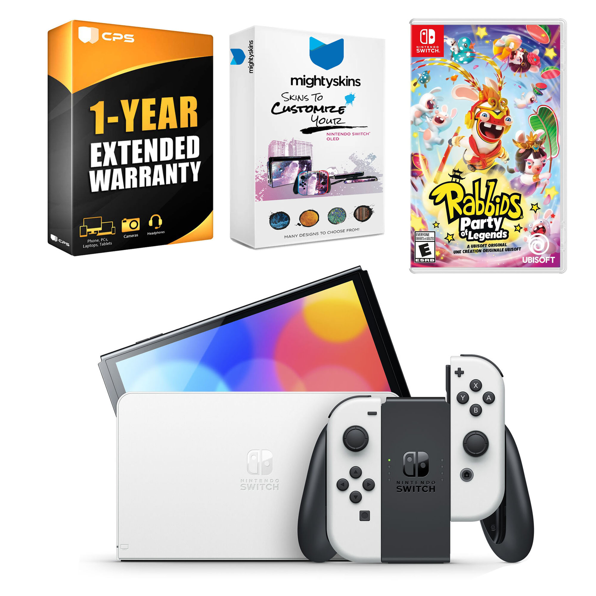 INCLUDED: Nintendo Switch OLED Console, Nintendo Switch OLED Dock, Rabbids: Party of Legends game, Left & Right Joy-Cons, Joy-Con Wrist Straps, Joy-Con Grip, High speed HDMI Cable, Nintendo Switch AC Adapter, MightySkins Voucher, and 1 Year CPS Extended Warranty