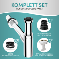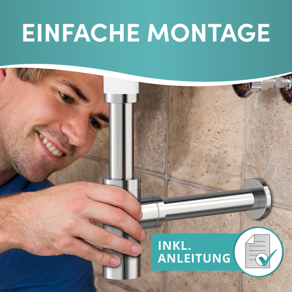 UNIVERSELL PASSEND - Das Design-Siphon passt mit seinem genormten 1 1/4" Einbaumaß perfekt zu allen handelsüblichen Waschbecken und Waschtischen. Extra lange Rohre sorgen für maximale Kompatibilität! Dank extra dicker Rohre ist das Abflussrohr besonders langlebig.RUNDUM SORGLOS PAKET - Das Komplett-Set bietet alles, was Sie brauchen, und mehr: Geruchsverschluss mit extra langem Tauchrohr, Gummimanschette, Dichtungen, Zusatzdichtungen und Öffnungswerkzeug.EINFACHER EINBAU - Eine verständliche Anleitung und das durchdachte Design machen den Einbau zum Kinderspiel. Selbst ohne umfangreiches Werkzeug können Sie unseren Röhrensiphon im Handumdrehen installieren.LEICHTE REINIGUNG - Die clever integrierte Reinigungsöffnung unseres Abflussrohrs lässt sich mühelos mit dem beiliegenden Werkzeug öffnen. So wird die Pflege spielend einfach, ohne lästige Demontage.