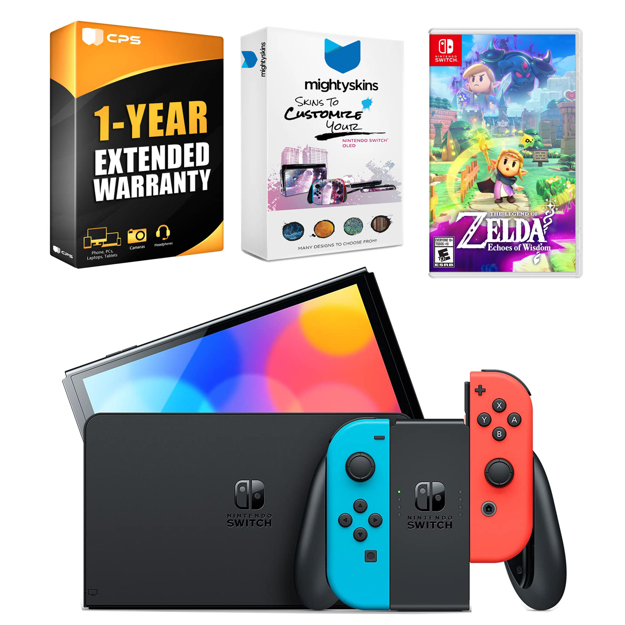 INCLUDED: Nintendo Switch OLED Console, Nintendo Switch OLED Dock, The The Legend Of Zelda: Echoes Of Wisdom game, Left & Right Joy-Cons, Joy-Con Wrist Straps, Joy-Con Grip, High speed HDMI Cable, Nintendo Switch AC Adapter, MightySkins Voucher, and 1 Year CPS Extended Warranty