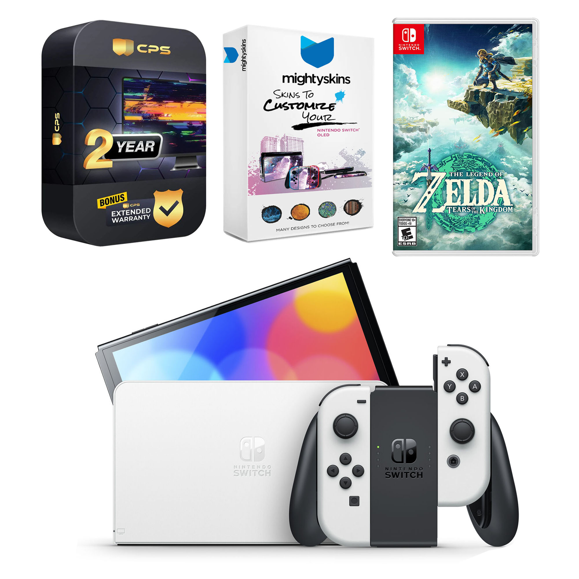 INCLUDED: Nintendo Switch OLED Console, Nintendo Switch OLED Dock, The Legend of Zelda: Tears of the Kingdom game, Left & Right Joy-Cons, Joy-Con Wrist Straps, Joy-Con Grip, High speed HDMI Cable, Nintendo Switch AC Adapter, MightySkins Voucher, and 2 Year CPS Extended Warranty