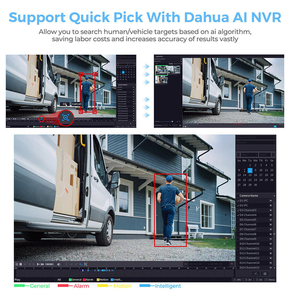 Dahua Smart Motion Detection technology works with intelligent algorithms to classify targets that trigger motion detection alarms. It filters out objects that are not targets, such as small and large animals, to avoid triggering false alarms. With an AI NVR, Quick Pick technology becomes available, allowing you to easily search for and pick out human and vehicle targets from SMD event videos, prioritizing the highest matches.