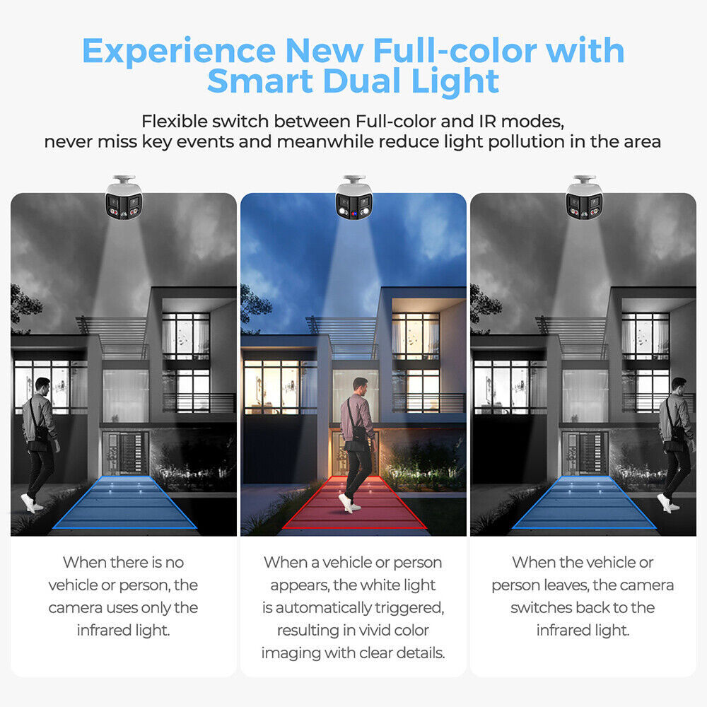 > Built-in IR LED and warm light, the max. IR illumination distance is 25 m and warm light distance is 20m.