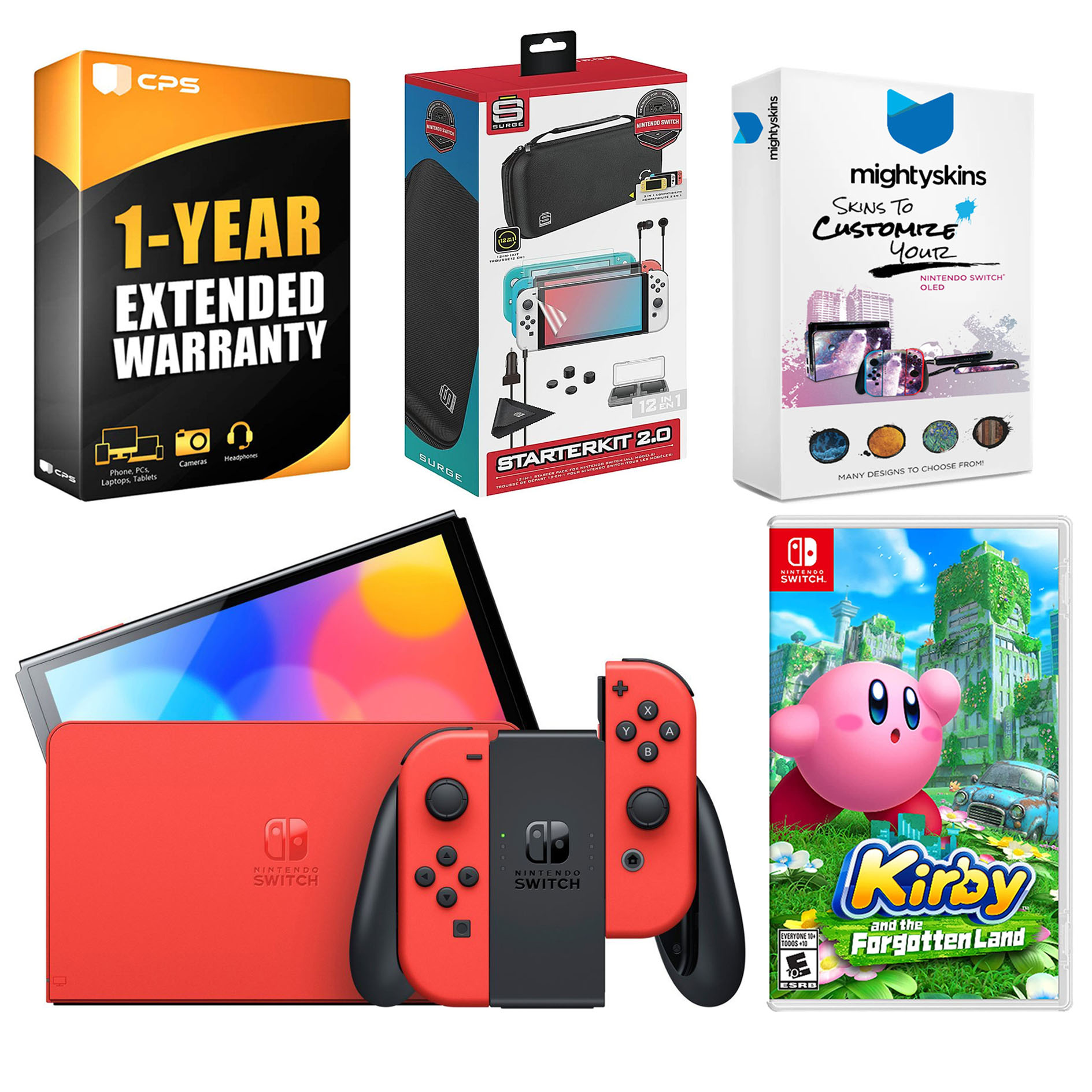 INCLUDED: Nintendo Switch OLED Console, Nintendo Switch OLED Dock, Kirby and the Forgotten Land game, Left & Right Joy-Cons, Joy-Con Wrist Straps, Joy-Con Grip, High speed HDMI Cable, Nintendo Switch AC Adapter, MightySkins Voucher, Surge Accessory Gaming Kit and 1 Year CPS Extended Warranty