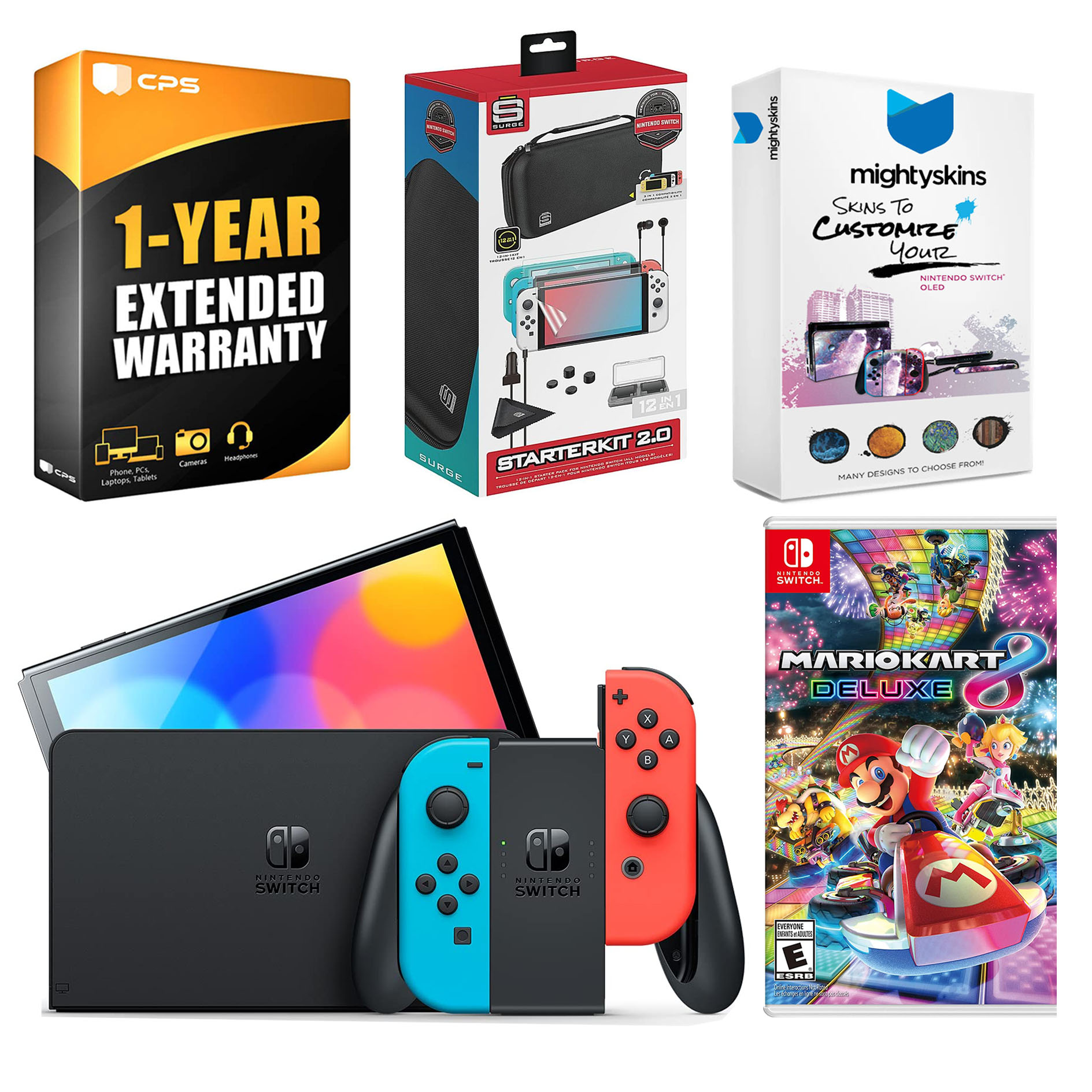 INCLUDED: Nintendo Switch OLED Console, Nintendo Switch OLED Dock, Left & Right Joy-Cons, Joy-Con Wrist Straps, Joy-Con Grip, High speed HDMI Cable, Nintendo Switch AC Adapter, MightySkins Voucher, Mario Kart 8 Deluxe game, Surge Accessory Gaming Kit, and 1 Year CPS Extended Warranty