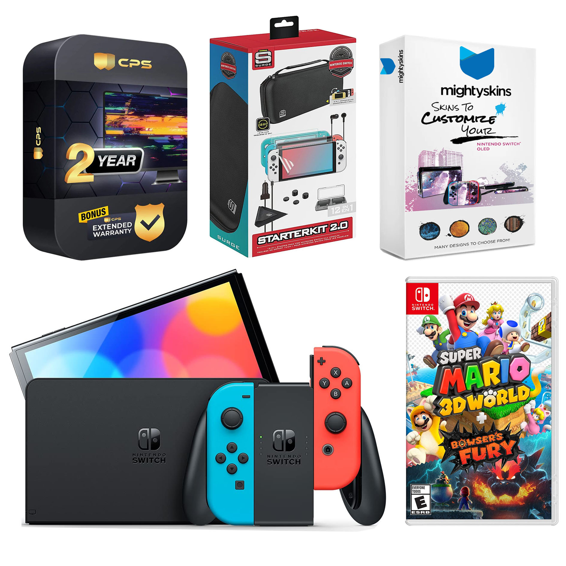 INCLUDED: Nintendo Switch OLED Console, Nintendo Switch OLED Dock, Left & Right Joy-Cons, Joy-Con Wrist Straps, Joy-Con Grip, High speed HDMI Cable, Nintendo Switch AC Adapter, MightySkins Voucher, Super Mario 3D World + Bowser’s Fury game, Surge Accessory Gaming Kit, and 2 Year CPS Extended Warranty