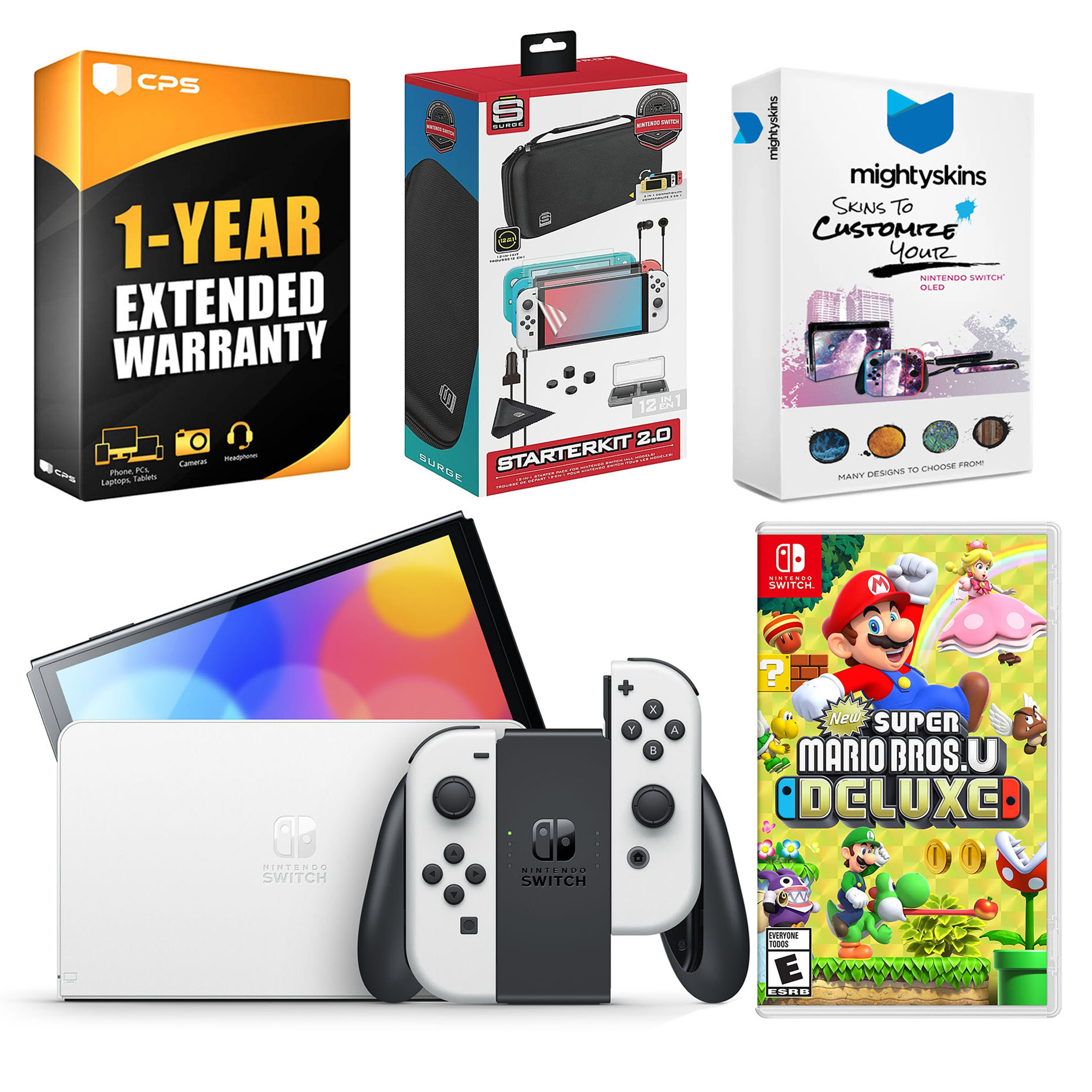 INCLUDED: Nintendo Switch OLED Console, Nintendo Switch OLED Dock, Left & Right Joy-Cons, Joy-Con Wrist Straps, Joy-Con Grip, High speed HDMI Cable, Nintendo Switch AC Adapter, New Super Mario Bros. U Deluxe game, Surge Accessory Gaming Kit, MightySkins Voucher, and 1 Year CPS Extended Warranty