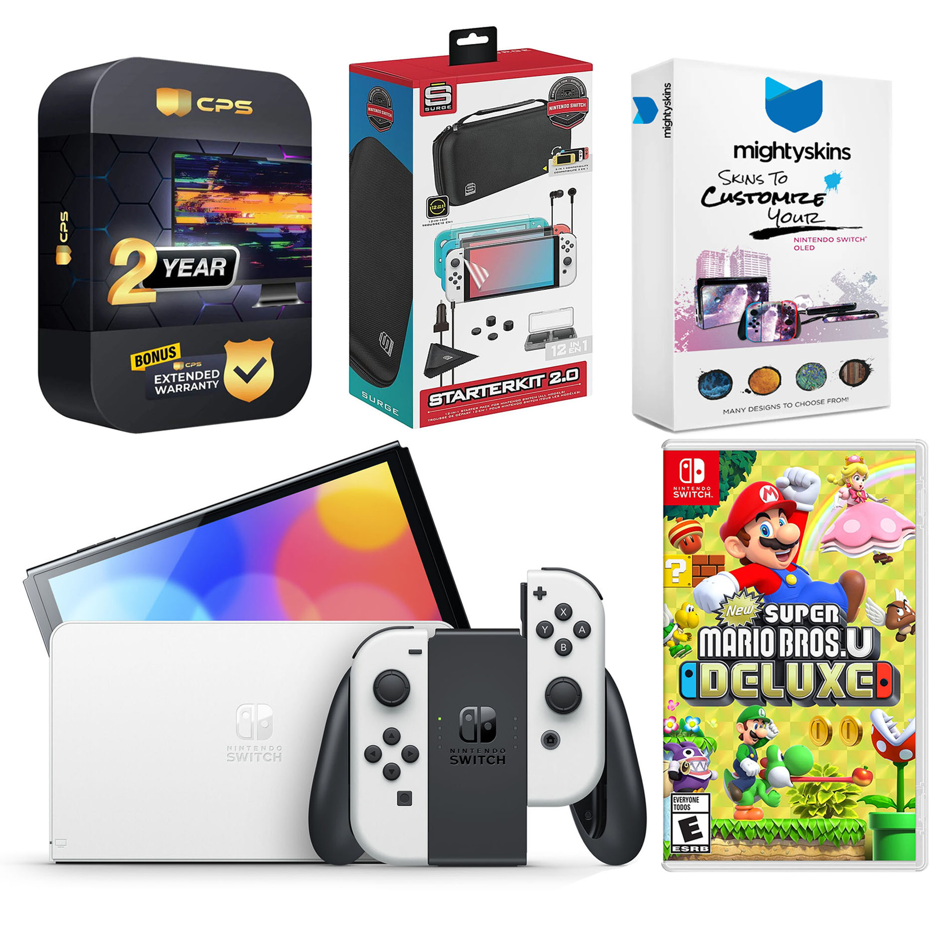 INCLUDED: Nintendo Switch OLED Console, Nintendo Switch OLED Dock, Left & Right Joy-Cons, Joy-Con Wrist Straps, Joy-Con Grip, High speed HDMI Cable, Nintendo Switch AC Adapter, New Super Mario Bros. U Deluxe game, Surge Accessory Gaming Kit, MightySkins Voucher, and 2 Year CPS Extended Warranty