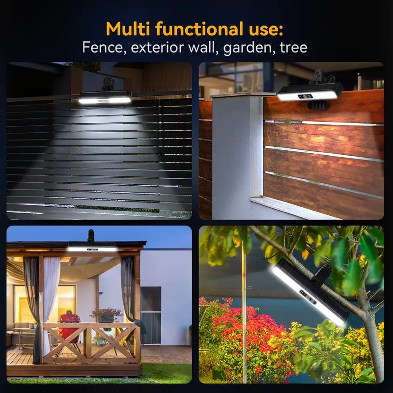 This clip on solar lights outdoor waterproof : 1. Clip on fence, umbrella, deck(diameter not exceeds 2.4”) 3 Light Modes: MODE 1. Stays Dim but brights up while motions detected. 2. Stays off but brights up while motions detected. 3.Always Stays Dim with/without motions.