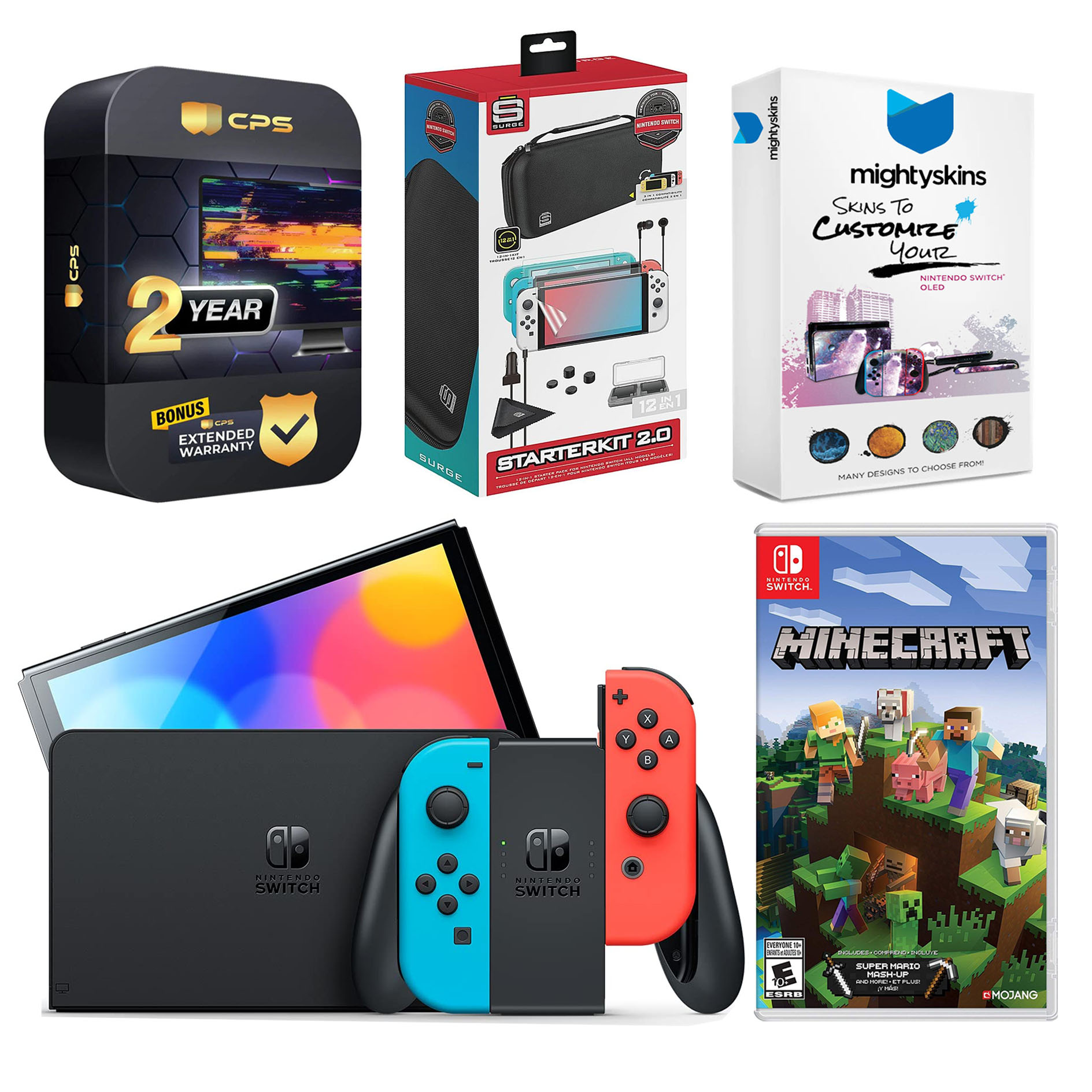 INCLUDED: Nintendo Switch OLED Console, Nintendo Switch OLED Dock, Left & Right Joy-Cons, Joy-Con Wrist Straps, Joy-Con Grip, High speed HDMI Cable, Nintendo Switch AC Adapter, MightySkins Voucher, Minecraft: Switch Edition game, Surge Accessory Gaming Kit, and 2 Year CPS Extended Warranty