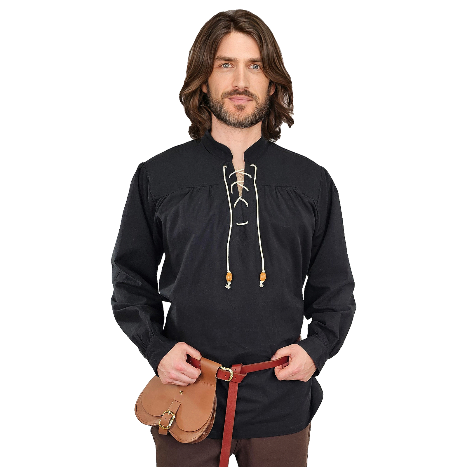 Unser klassisches, Mittelalter Hemd ist aus 100% Baumwolle, wodurch es einen angenehmen Tragekomfort erhält. Der Stoff ist an den oberen Schulterteilen leicht gerafft, dadurch bekommt es seinen weiten Schnitt und verleiht dem Mittelalterhemd einen mittelalterlichen Look. Außerdem sorgt der Schnitt für eine bequeme Passform, die typisch für die Mode dieser Epoche ist. Der Stehkragen bringt eine schlichte Eleganz in dieses Kleidungsstück. Der Ausschnitt ist mit einer Schnürung versehen, welche nicht nur ein dekoratives Element darstellt, sondern ebenfalls das An- und Ausziehen erleichtert. Die Bänder der Schnürung sind mit Holzperlen verziert, was dem Hemd einen zusätzlichen rustikalen Charme verleiht.